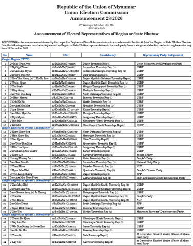 Submitted by moiuser3 on 2 February 2026 Republic of the Union of Myanmar Union Election Commission Announcement 28/2026
