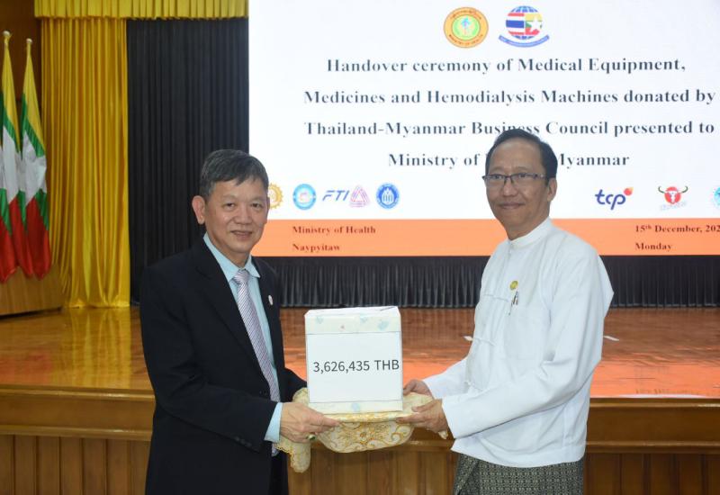 The Bangkok-based Thai–Myanmar Business Council held a handover ceremony yesterday at the Ministry of Health in Nay Pyi Taw for the donated medicines and medical supplies in support of the Ministry of Health’s earthquake response efforts.