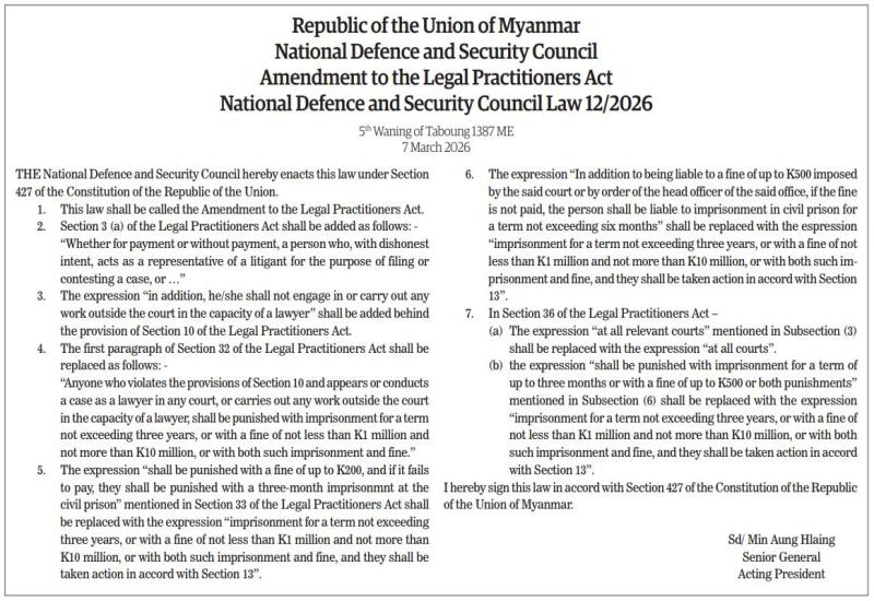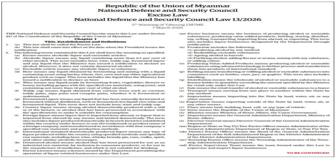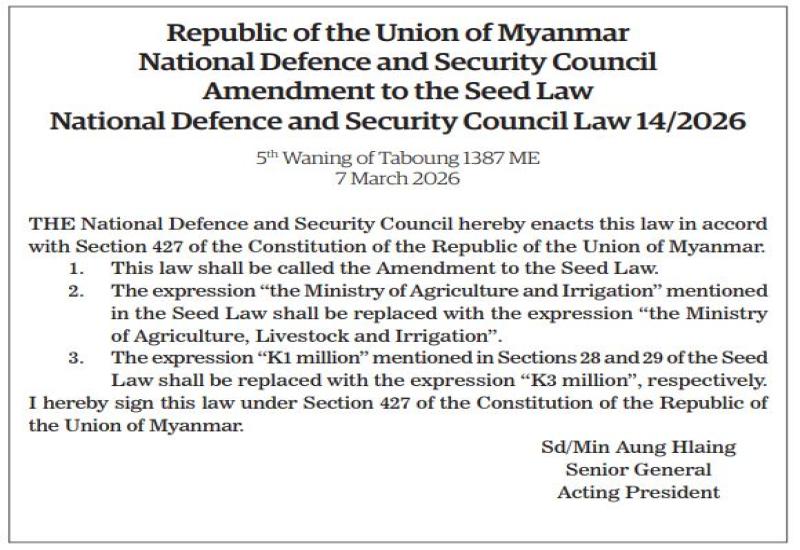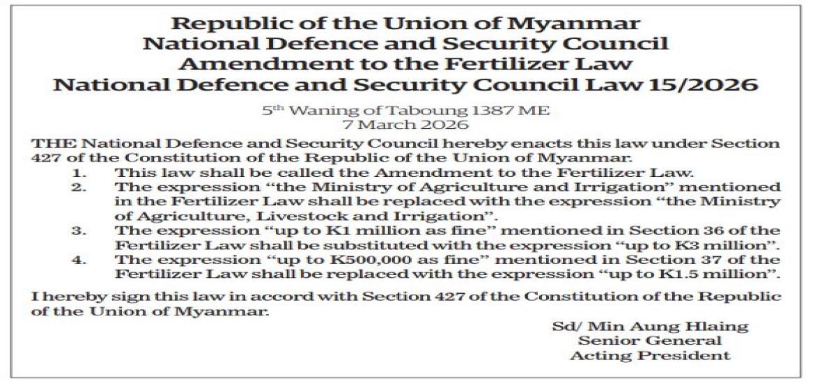 Parts of Yangon report unhealthy air for sensitive groups | Mar 08, 2026 National Defence and Security Council Law 13/2026 | Mar 08, 2026 National Defence and Security Council Law 15/2026 | Mar 08, 2026 National Defence and Security Council Law 14/2026 | Mar 08, 2026 National Defence and Security Council Law 12/2026 | Mar 08, 2026 Research Expanded to Develop National Cancer Registry | Mar 08, 2026 Second Phase of Mekong-Lancang Science & Tech Cooperation Project launched | Mar 07, 2026 The launching ceremony of the Second Phase of the Mekong-Lanca MoI Union Minister attends World Engineering Day events in Jakarta | Mar 07, 2026 Union Minister for Industry Dr Charlie Than left Yangon for Ja Govt Adopts Comprehensive Approach to Planning | Mar 07, 2026 Acting President of the Republic of the Union of Myanmar and S Latest News | Mar 08, 2026 Parts of Yangon report unhealthy air for sensitive groups | Mar 08, 2026 National Defence and Security Council Law 13/2026 | Mar 08, 2026 National Defence and Security Council Law 15/2026 | Mar 08, 2026 National Defence and Security Council Law 14/2026 | Mar 08, 2026 National Defence and Security Council Law 12/2026 | Mar 08, 2026 Research Expanded to Develop National Cancer Registry Most Popular Mongphone Sayadaw donates K50 mln to restore Mahamuni Pagoda Apr 23, 2025 182 EPS Myanmar workers deployed on 22 Apr Apr 23, 2025 21 cold storage facilities gear up to export freshwater fish to Saudi Arabia Apr 23, 2025 Myanmar-China Friendship Association funds religious site restorations in Mandalay & Sagaing Apr 23, 2025 Deputy PM MoTC Union Minister inspects Pyinmana Station, Cybersecurity Department Apr 23, 2025 Yangon’s high-rise apartment sales decline Apr 23, 2025 CHAIRMAN OF THE STATE ADMINISTRATION COUNCIL'S SPEECH CONSTITUTION OF THE REPUBLIC OF THE UNION OF MYANMAR(2008) FIVE-POINT ROAD MAP OF THE STATE ADMINISTRATION COUNCIL FOUR OBJECTIVES OF THE NATIONAL DEFENCE AND SECURITY COUNCIL