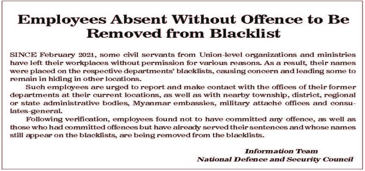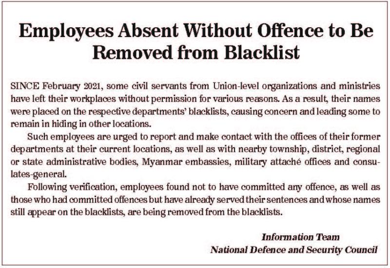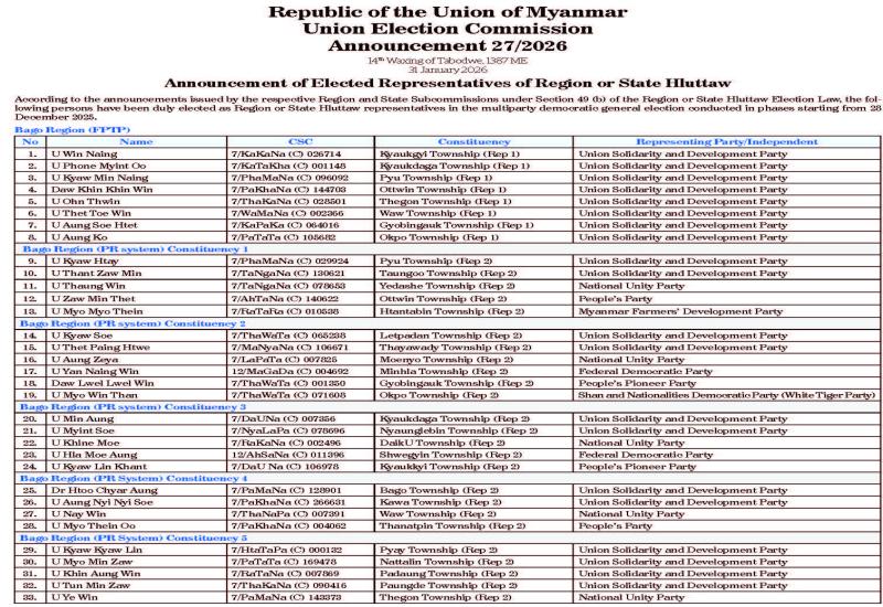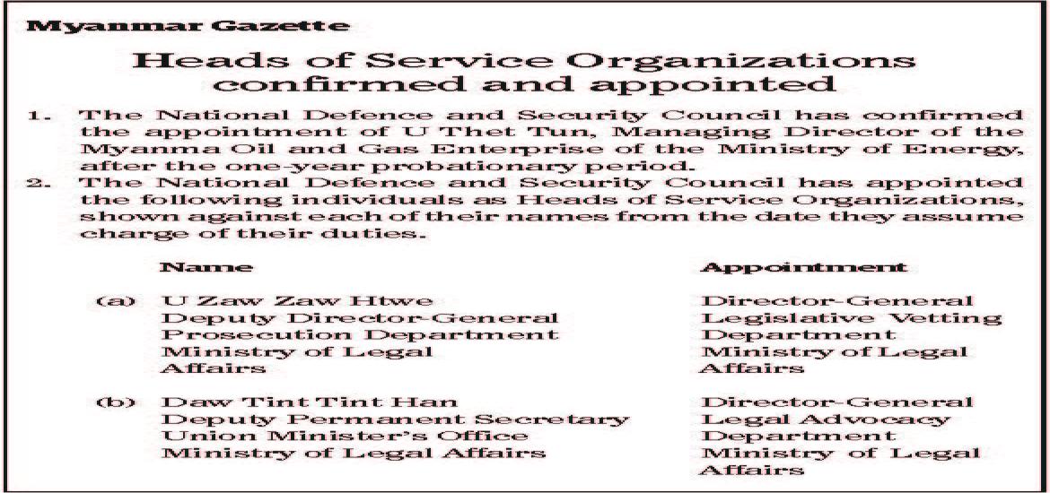 Announcement of Elected Representatives of Region or State Hluttaw | Feb 01, 2026 Employees Absent Without Offence to Be Removed from Blacklist | Feb 01, 2026 Heads of Service Organizations confirmed and appointed | Feb 01, 2026 Individuals engaged in telecom fraud and online gambling detained along with related materials in Kunhing Township | Feb 01, 2026 Nay Pyi Taw Council and regions, states to participate in Union-Level MSME Product Fair | Feb 01, 2026 60 container ships scheduled to call at Yangon Port in Feb | Feb 01, 2026 Passport services temporarily suspended; Embassy issues emergency contact | Jan 31, 2026 Rakhine State National United Party Statement | Jan 31, 2026 Notification 26/2026 | Jan 31, 2026 Latest News | Feb 01, 2026 Announcement of Elected Representatives of Region or State Hluttaw | Feb 01, 2026 Employees Absent Without Offence to Be Removed from Blacklist | Feb 01, 2026 Heads of Service Organizations confirmed and appointed | Feb 01, 2026 Individuals engaged in telecom fraud and online gambling detained along with related materials in Kunhing Township | Feb 01, 2026 Nay Pyi Taw Council and regions, states to participate in Union-Level MSME Product Fair | Feb 01, 2026 60 container ships scheduled to call at Yangon Port in Feb Most Popular 182 EPS Myanmar workers deployed on 22 Apr Apr 23, 2025 21 cold storage facilities gear up to export freshwater fish to Saudi Arabia Apr 23, 2025 Myanmar-China Friendship Association funds religious site restorations in Mandalay & Sagaing Apr 23, 2025 Deputy PM MoTC Union Minister inspects Pyinmana Station, Cybersecurity Department Apr 23, 2025 Yangon’s high-rise apartment sales decline Apr 23, 2025 13 minor tremors shake Myanmar-Thailand border on 22 Apr Apr 23, 2025 CHAIRMAN OF THE STATE ADMINISTRATION COUNCIL'S SPEECH CONSTITUTION OF THE REPUBLIC OF THE UNION OF MYANMAR(2008) FIVE-POINT ROAD MAP OF THE STATE ADMINISTRATION COUNCIL FOUR OBJECTIVES OF THE NATIONAL DEFENCE AND SECURITY COUNCIL