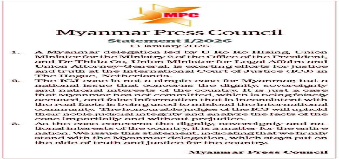 Mottos for 79th Union Day 2026 | Jan 14, 2026 Myanmar deports 130 undocumented foreign entrants | Jan 14, 2026 5 self-styled PDF members rejoin legal fold in Kayin State | Jan 14, 2026 Scenic PyinOoLwin-Gokteik train sees passenger boost | Jan 14, 2026 CBM Governor meets Pakistani Ambassador | Jan 14, 2026 Myanmar, Pakistan discuss boosting livestock, dairy sectors and market access | Jan 14, 2026 Myanmar Press Council Statement 1/2026 | Jan 14, 2026 Youth Peace Forum 2026 kicks off in Nay Pyi Taw | Jan 14, 2026 Press Statement: Myanmar’s Commitment to Truth and Justice at the International Court of Justice | Jan 14, 2026 Latest News | Jan 14, 2026 Mottos for 79th Union Day 2026 | Jan 14, 2026 Myanmar deports 130 undocumented foreign entrants | Jan 14, 2026 5 self-styled PDF members rejoin legal fold in Kayin State | Jan 14, 2026 Scenic PyinOoLwin-Gokteik train sees passenger boost | Jan 14, 2026 CBM Governor meets Pakistani Ambassador | Jan 14, 2026 Myanmar, Pakistan discuss boosting livestock, dairy sectors and market access Most Popular Government employees resume duties with renewed energy Apr 23, 2025 2,400 tonnes of cement arrive at Yangon Port to meet demand Apr 23, 2025 8th batch of China’s humanitarian aid arrives in Yangon Apr 23, 2025 Mongphone Sayadaw donates K50 mln to restore Mahamuni Pagoda Apr 23, 2025 182 EPS Myanmar workers deployed on 22 Apr Apr 23, 2025 21 cold storage facilities gear up to export freshwater fish to Saudi Arabia Apr 23, 2025 CHAIRMAN OF THE STATE ADMINISTRATION COUNCIL'S SPEECH CONSTITUTION OF THE REPUBLIC OF THE UNION OF MYANMAR(2008) FIVE-POINT ROAD MAP OF THE STATE ADMINISTRATION COUNCIL FOUR OBJECTIVES OF THE NATIONAL DEFENCE AND SECURITY COUNCIL