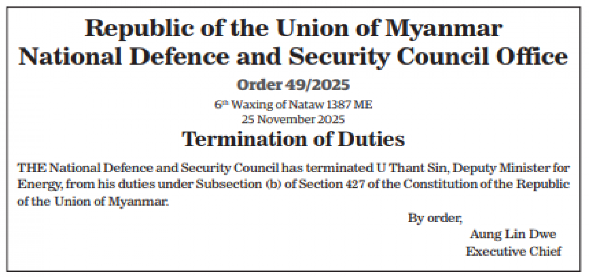 Science Festival Myanmar 2025 enters second day | Nov 26, 2025 MoI Union Minister urges timely completion of 3-storey RC Sarso Beikman | Nov 26, 2025 Republic of the Union of Myanmar National Defence and Security Council Office | Nov 26, 2025 Thilawa SEZ to complete modern warehouse, jetty by end-2025 | Nov 26, 2025 MFSPEA invites member companies to import fertilizer for Q1 2026 | Nov 26, 2025 Ayeyawady Region plans salt production boost amid high prices | Nov 26, 2025 Nearly 400 residents receive care from Tatmadaw mobile medical team | Nov 26, 2025 237 scam hub buildings demolished in KK Park, 51 illegal foreign entrants detained in Shwe Kokko | Nov 26, 2025 New Generation Wunthanu Party talks about its policy, stance and work procedures | Nov 25, 2025 Latest News | Nov 26, 2025 Science Festival Myanmar 2025 enters second day | Nov 26, 2025 MoI Union Minister urges timely completion of 3-storey RC Sarso Beikman | Nov 26, 2025 Republic of the Union of Myanmar National Defence and Security Council Office | Nov 26, 2025 Thilawa SEZ to complete modern warehouse, jetty by end-2025 | Nov 26, 2025 MFSPEA invites member companies to import fertilizer for Q1 2026 | Nov 26, 2025 Ayeyawady Region plans salt production boost amid high prices Most Popular Myanmar extradites 20 undocumented entrants Apr 23, 2025 2,400 tonnes of cement arrive at Yangon Port to meet demand Apr 23, 2025 21 cold storage facilities gear up to export freshwater fish to Saudi Arabia Apr 23, 2025 Yangon’s high-rise apartment sales decline Apr 23, 2025 Nay Pyi Taw Development Committee invites tender for 5,000 tonnes of coal Apr 23, 2025 Mongphone Sayadaw donates K50 mln to restore Mahamuni Pagoda Apr 23, 2025 CHAIRMAN OF THE STATE ADMINISTRATION COUNCIL'S SPEECH CONSTITUTION OF THE REPUBLIC OF THE UNION OF MYANMAR(2008) FIVE-POINT ROAD MAP OF THE STATE ADMINISTRATION COUNCIL FOUR OBJECTIVES OF THE NATIONAL DEFENCE AND SECURITY COUNCIL