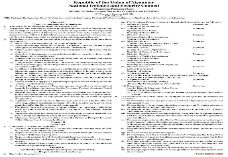 Myanmar Passport Law (National Defence and Security Council Law 19/2026) | Mar 18, 2026 Union Tax Law 2026 | Mar 18, 2026 Public Notice 17 March 2026 | Mar 18, 2026 Head of Service Organization appointed | Mar 18, 2026 2025-2026 matric exams conclude smoothly nationwide | Mar 18, 2026 NIA arrests 6 Ukrainians, 1 American over alleged terror plot in India | Mar 18, 2026 Myanmar officials share electoral insights at Kazakhstan referendum observation | Mar 18, 2026 Union Education Minister oversees exams in Nay Pyi Taw | Mar 18, 2026 Committee on Myanmar-Thailand Transboundary Haze Pollution Prevention holds meeting | Mar 18, 2026 Latest News | Mar 18, 2026 Myanmar Passport Law (National Defence and Security Council Law 19/2026) | Mar 18, 2026 Union Tax Law 2026 | Mar 18, 2026 Public Notice 17 March 2026 | Mar 18, 2026 Head of Service Organization appointed | Mar 18, 2026 2025-2026 matric exams conclude smoothly nationwide | Mar 18, 2026 NIA arrests 6 Ukrainians, 1 American over alleged terror plot in India Most Popular Government employees resume duties with renewed energy Apr 23, 2025 2,400 tonnes of cement arrive at Yangon Port to meet demand Apr 23, 2025 8th batch of China’s humanitarian aid arrives in Yangon Apr 23, 2025 Mongphone Sayadaw donates K50 mln to restore Mahamuni Pagoda Apr 23, 2025 182 EPS Myanmar workers deployed on 22 Apr Apr 23, 2025 21 cold storage facilities gear up to export freshwater fish to Saudi Arabia Apr 23, 2025 CHAIRMAN OF THE STATE ADMINISTRATION COUNCIL'S SPEECH CONSTITUTION OF THE REPUBLIC OF THE UNION OF MYANMAR(2008) FIVE-POINT ROAD MAP OF THE STATE ADMINISTRATION COUNCIL FOUR OBJECTIVES OF THE NATIONAL DEFENCE AND SECURITY COUNCIL