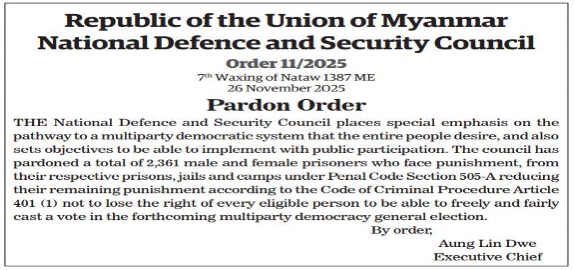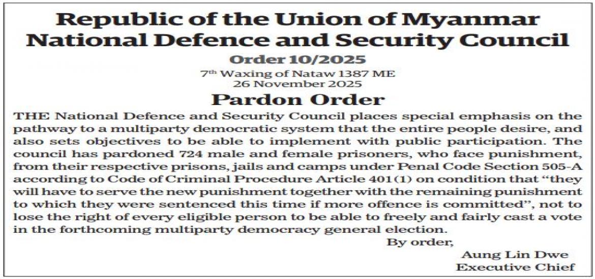 Republic of the Union of Myanmar National Defence and Security Council Order 11/2025 | Nov 27, 2025 Republic of the Union of Myanmar National Defence and Security Council Order 10/2025 | Nov 27, 2025 China-Myanmar cooperation prospects discussed under 15th Five-Year Plan | Nov 27, 2025 Myanmar’s shrimp export exceeds 6,000 MT in past seven months (Apr-Oct) | Nov 27, 2025 Scam hubs torn down, nearly 200 undocumented foreign entrants arrested in Myawady | Nov 27, 2025 Tatmadaw delegates attends 26th ASEAN Chiefs of Army Multilateral Meeting | Nov 27, 2025 Tikyit plant boosts power to 120 MW following dryer installation | Nov 27, 2025 60th Myanma Gems Emporium achieves strong sales of jade, pearls and gemstones | Nov 27, 2025 Biography of President of the Republic of Belarus His Excellency Mr Aleksandr Lukashenko | Nov 27, 2025 Latest News | Nov 27, 2025 Republic of the Union of Myanmar National Defence and Security Council Order 11/2025 | Nov 27, 2025 Republic of the Union of Myanmar National Defence and Security Council Order 10/2025 | Nov 27, 2025 China-Myanmar cooperation prospects discussed under 15th Five-Year Plan | Nov 27, 2025 Myanmar’s shrimp export exceeds 6,000 MT in past seven months (Apr-Oct) | Nov 27, 2025 Scam hubs torn down, nearly 200 undocumented foreign entrants arrested in Myawady | Nov 27, 2025 Tatmadaw delegates attends 26th ASEAN Chiefs of Army Multilateral Meeting Most Popular Myanmar extradites 20 undocumented entrants Apr 23, 2025 2,400 tonnes of cement arrive at Yangon Port to meet demand Apr 23, 2025 21 cold storage facilities gear up to export freshwater fish to Saudi Arabia Apr 23, 2025 Yangon’s high-rise apartment sales decline Apr 23, 2025 Nay Pyi Taw Development Committee invites tender for 5,000 tonnes of coal Apr 23, 2025 Mongphone Sayadaw donates K50 mln to restore Mahamuni Pagoda Apr 23, 2025 CHAIRMAN OF THE STATE ADMINISTRATION COUNCIL'S SPEECH CONSTITUTION OF THE REPUBLIC OF THE UNION OF MYANMAR(2008) FIVE-POINT ROAD MAP OF THE STATE ADMINISTRATION COUNCIL FOUR OBJECTIVES OF THE NATIONAL DEFENCE AND SECURITY COUNCIL