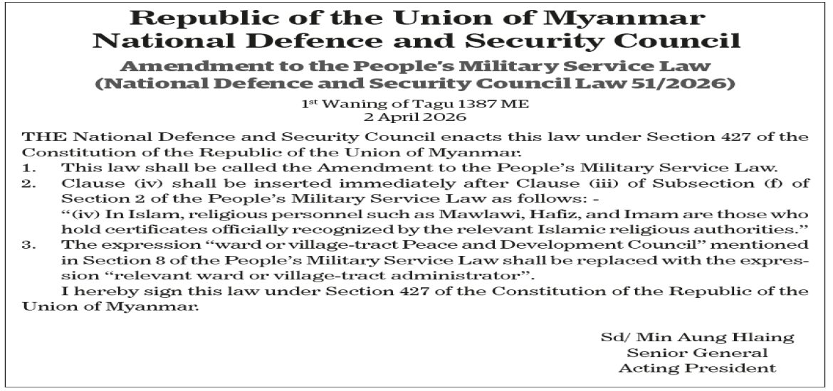 National Defence and Security Council Law 51/2026 | Apr 03, 2026 Public Notice | Apr 03, 2026 Trading amount and foreign exchange rate in the FE market on 31 March 2026 | Apr 03, 2026 Minbu opens heatwave shelters amid soaring temperatures in Magway Region | Apr 03, 2026 ME in Seoul supports case of worker who died in industrial accident | Apr 03, 2026 Hpa-an-Kawkareik-Myawady Asian Highway section reopens | Apr 03, 2026 MR adds parcel carriages to boost goods transport | Apr 03, 2026 Pyidaungsu Hluttaw to Elect President Today | Apr 03, 2026 Discussions held to open heat relief centres | Apr 02, 2026 A coo Latest News | Apr 03, 2026 National Defence and Security Council Law 51/2026 | Apr 03, 2026 Public Notice | Apr 03, 2026 Trading amount and foreign exchange rate in the FE market on 31 March 2026 | Apr 03, 2026 Minbu opens heatwave shelters amid soaring temperatures in Magway Region | Apr 03, 2026 ME in Seoul supports case of worker who died in industrial accident | Apr 03, 2026 Hpa-an-Kawkareik-Myawady Asian Highway section reopens Most Popular 8th batch of China’s humanitarian aid arrives in Yangon Apr 23, 2025 Mongphone Sayadaw donates K50 mln to restore Mahamuni Pagoda Apr 23, 2025 182 EPS Myanmar workers deployed on 22 Apr Apr 23, 2025 21 cold storage facilities gear up to export freshwater fish to Saudi Arabia Apr 23, 2025 Myanmar-China Friendship Association funds religious site restorations in Mandalay & Sagaing Apr 23, 2025 Deputy PM MoTC Union Minister inspects Pyinmana Station, Cybersecurity Department Apr 23, 2025 CHAIRMAN OF THE STATE ADMINISTRATION COUNCIL'S SPEECH CONSTITUTION OF THE REPUBLIC OF THE UNION OF MYANMAR(2008) FIVE-POINT ROAD MAP OF THE STATE ADMINISTRATION COUNCIL FOUR OBJECTIVES OF THE NATIONAL DEFENCE AND SECURITY COUNCIL
