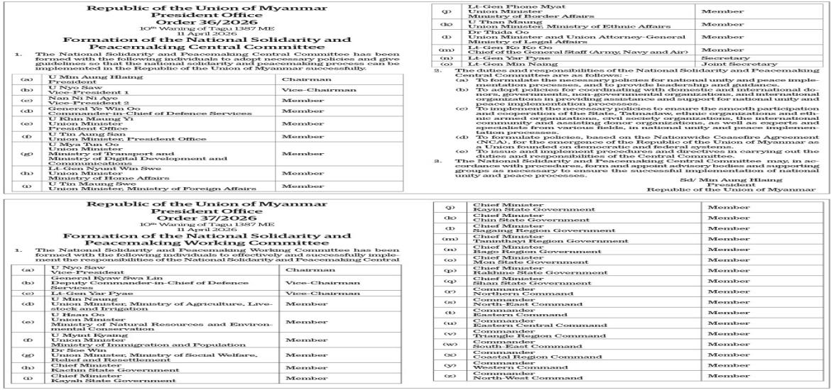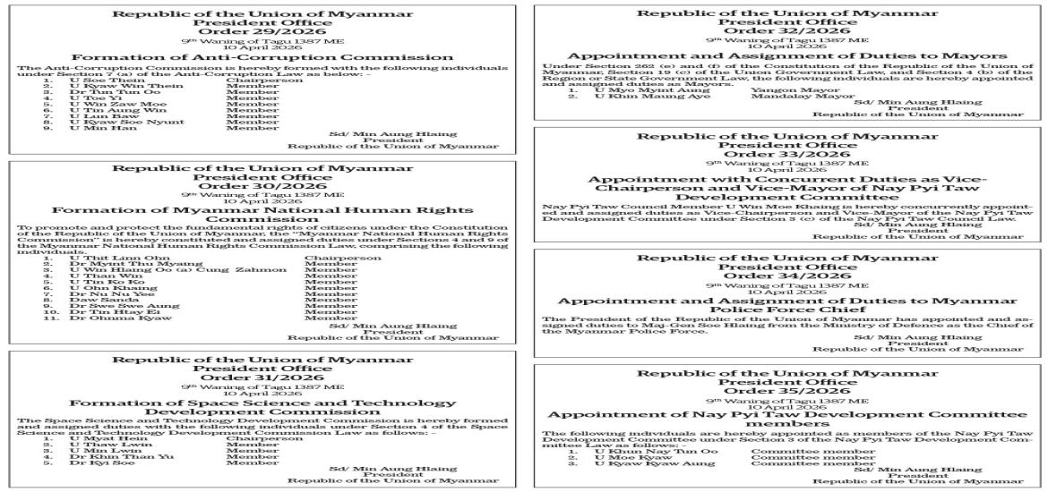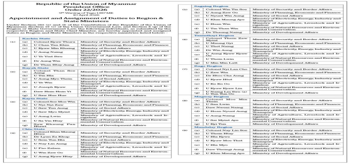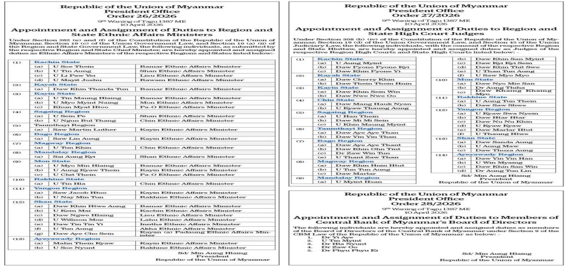 Vice-President receives India’s Minister of State for External Affairs | Apr 12, 2026 Vice-President receives India’s Minister of State for External Affairs | Apr 12, 2026 Order 36/2026-Order 38/2026 | Apr 12, 2026 Order 29/2026-Order 35/2026 | Apr 12, 2026 India seeks to step up engagement as Myanmar elects new president | Apr 12, 2026 Order 26/2026-Order 28/2026 | Apr 12, 2026 Order 24/2026-Order 25/2026 | Apr 12, 2026 Order 22/2026 | Apr 12, 2026 Order 17/2026-23/2026 | Apr 12, 2026 Latest News | Apr 12, 2026 Vice-President receives India’s Minister of State for External Affairs | Apr 12, 2026 Vice-President receives India’s Minister of State for External Affairs | Apr 12, 2026 Order 36/2026-Order 38/2026 | Apr 12, 2026 Order 29/2026-Order 35/2026 | Apr 12, 2026 India seeks to step up engagement as Myanmar elects new president | Apr 12, 2026 Order 26/2026-Order 28/2026 Most Popular Mongphone Sayadaw donates K50 mln to restore Mahamuni Pagoda Apr 23, 2025 182 EPS Myanmar workers deployed on 22 Apr Apr 23, 2025 21 cold storage facilities gear up to export freshwater fish to Saudi Arabia Apr 23, 2025 Myanmar-China Friendship Association funds religious site restorations in Mandalay & Sagaing Apr 23, 2025 Deputy PM MoTC Union Minister inspects Pyinmana Station, Cybersecurity Department Apr 23, 2025 Yangon’s high-rise apartment sales decline Apr 23, 2025 SPEECHS OF THE PRESIDENT OF THE REPUBLIC OF THE UNION OF MYANMAR CONSTITUTION OF THE REPUBLIC OF THE UNION OF MYANMAR(2008) FIVE-POINT ROAD MAP OF THE STATE ADMINISTRATION COUNCIL FOUR OBJECTIVES OF THE NATIONAL DEFENCE AND SECURITY COUNCIL