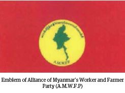 THE Alliance of Myanmar’s Worker and Farmer Party (A.M.W.F.P) headquartered at No. 2626, Inn Win (4) Street, Nandawyar Ward, Bago in Bago Region, submitted an application for registration as a political party in accord with the Section 5 of the Political Parties Registration Law on 19-12-2019. In their application, they mention that they will use the name, the flag and the emblem as described hereunder.