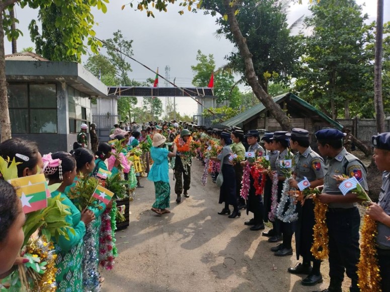 Officers of the Sittway Station of Western Command, members of Myanmar Police Force and relevant departmental officials, and local ethnic people welcomed back returnee soldiers with heartfelt enthusiasm.
