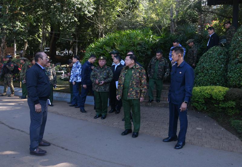Chairman of the State Security and Peace Commission and Commander-in-Chief of Defence Services Senior General Min Aung Hlaing, accompanied by Commander-in-Chief (Navy) Admiral Htein Win, Commander-in-Chief (Air) General Tun Aung and officials, inspected progress in the construction of the war veteran housing in PyinOoLwin yesterday morning.
