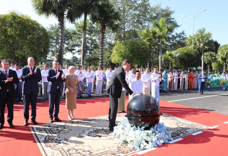 To promote the long-term strengthening of friendly diplomatic relations between the Republic of the Union of Myanmar and the Republic of Belarus, a naming ceremony was held in Nay Pyi Taw yesterday morning. A ceremony to name the road connecting Yazathingaha Road and Zabukyetthayay Road was held with the name of Minsk, which is the capital city of Belarus. The event took place near the advanced market at the corner of Yazathingaha Road and Thirikyawswa Road.