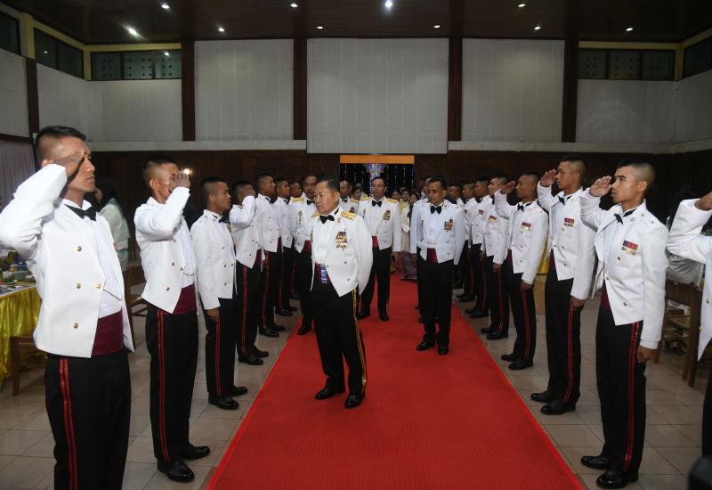 The graduation dinner for 129th intake of the Tatmadaw (Army) Officer Training School (Bahtoo) Thiha Company was held yesterday evening at the Military Appointments Hall of the school in Bahtoo Township. The ceremony was attended by Vice-Senior General Soe Win, Vice-Chairman of the State Security and Peace Commission, Deputy Commander-in-Chief of the Defence Services, and Commander-in-Chief (Army), on behalf of the Chairman of the State Security and Peace Commission and Commander-in-Chief of the Defence Services.