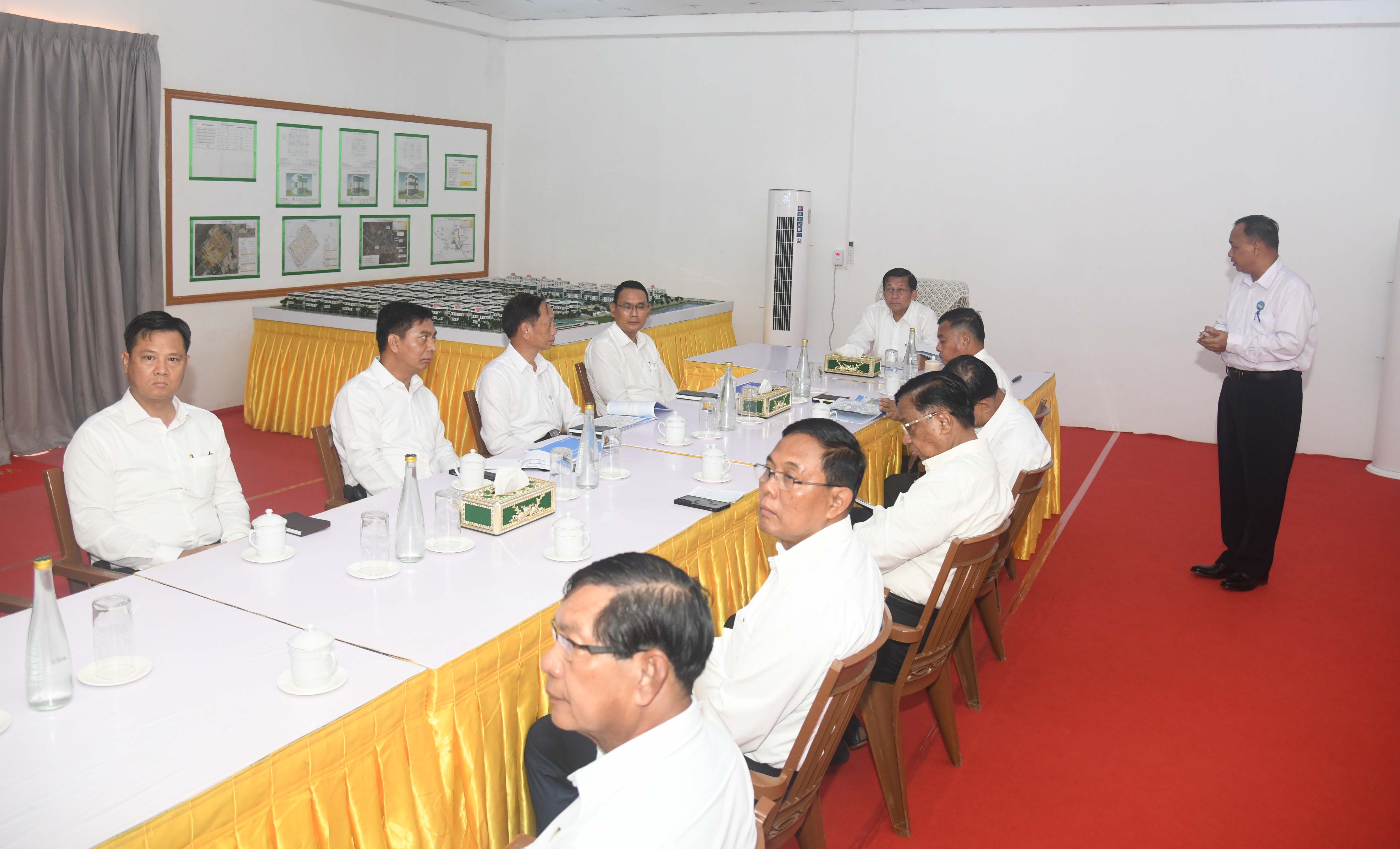 When they arrived at the housing, Quartermaster-General Lt-Gen Zaw Hein reported on the accomplishment of the guidance given by the Head of State, a plan to build the solar plant for the housing area, efforts to complete more buildings on time, and construction of the brick drains in the housing to ensure proper flow of water.
