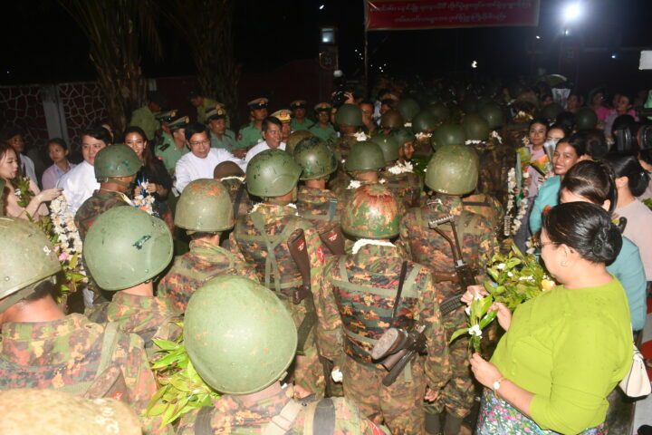At the welcoming ceremony, the victorious returning soldiers marched into their respective battalion headquarters accompanied by a military band. Yangon Region Chief Minister U Soe Thein and his wife, Yangon Command Commander Maj-Gen Pyae Sone Lin and his wife, members of the regional government and their wives, officials, artistes, ethnic community members, and the public greeted them with garlands, and the chief minister presented cash awards to the victorious Tatmadaw members.