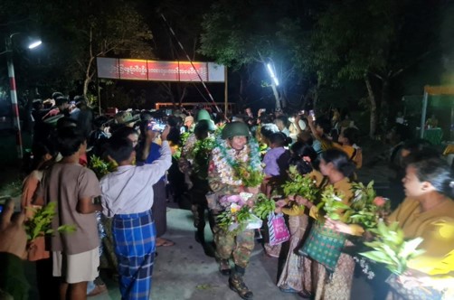 Brig-Gen Tun Tun Oo, along with officers, soldiers, family members, departmental officials, and local ethnic people, welcome the victorious Tatmadaw members with sprigs of Eugenia, garlands, and floral tributes. The joyous celebration featured the beating of traditional drums, the playing of musical instruments, and lively dances.