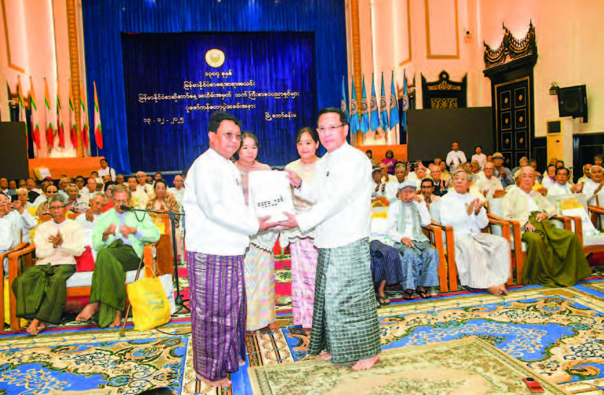After the ceremonial procedures, the attendees paid respect to 288 elderly literati, and Sayagyi Ledwintha Saw Chit delivered words of advice on behalf of the elderly.