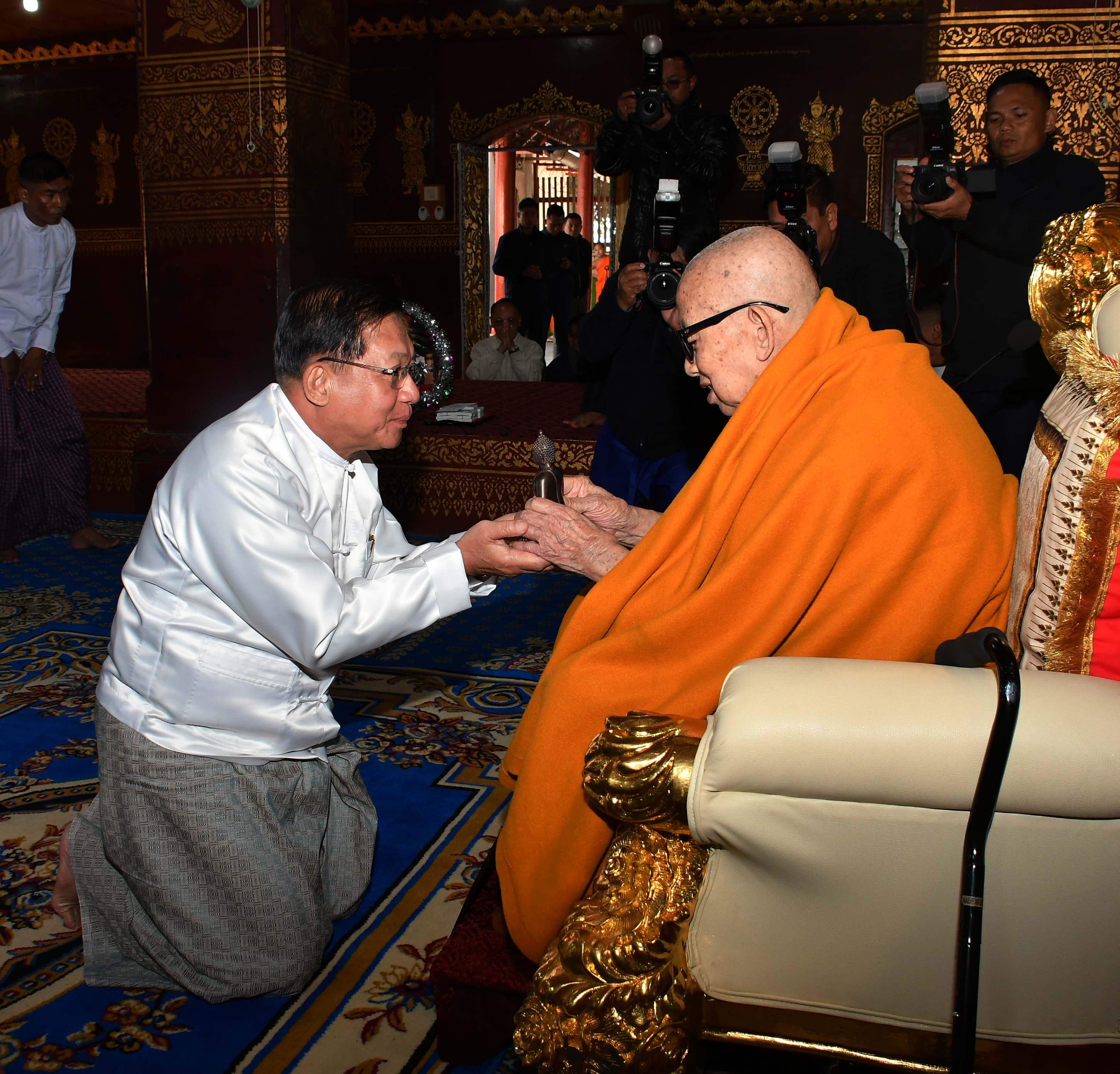 In this regard, a ceremony to offer the Sithu title to Presiding Patron of the Kengying Monastery of Kengtung long-life Sayadaw Aggamaha Saddhammajotikadhaja Bhaddanta Khemacara was held at Dhammayon of Kengying Monastery this morning, attended by the Senior General.