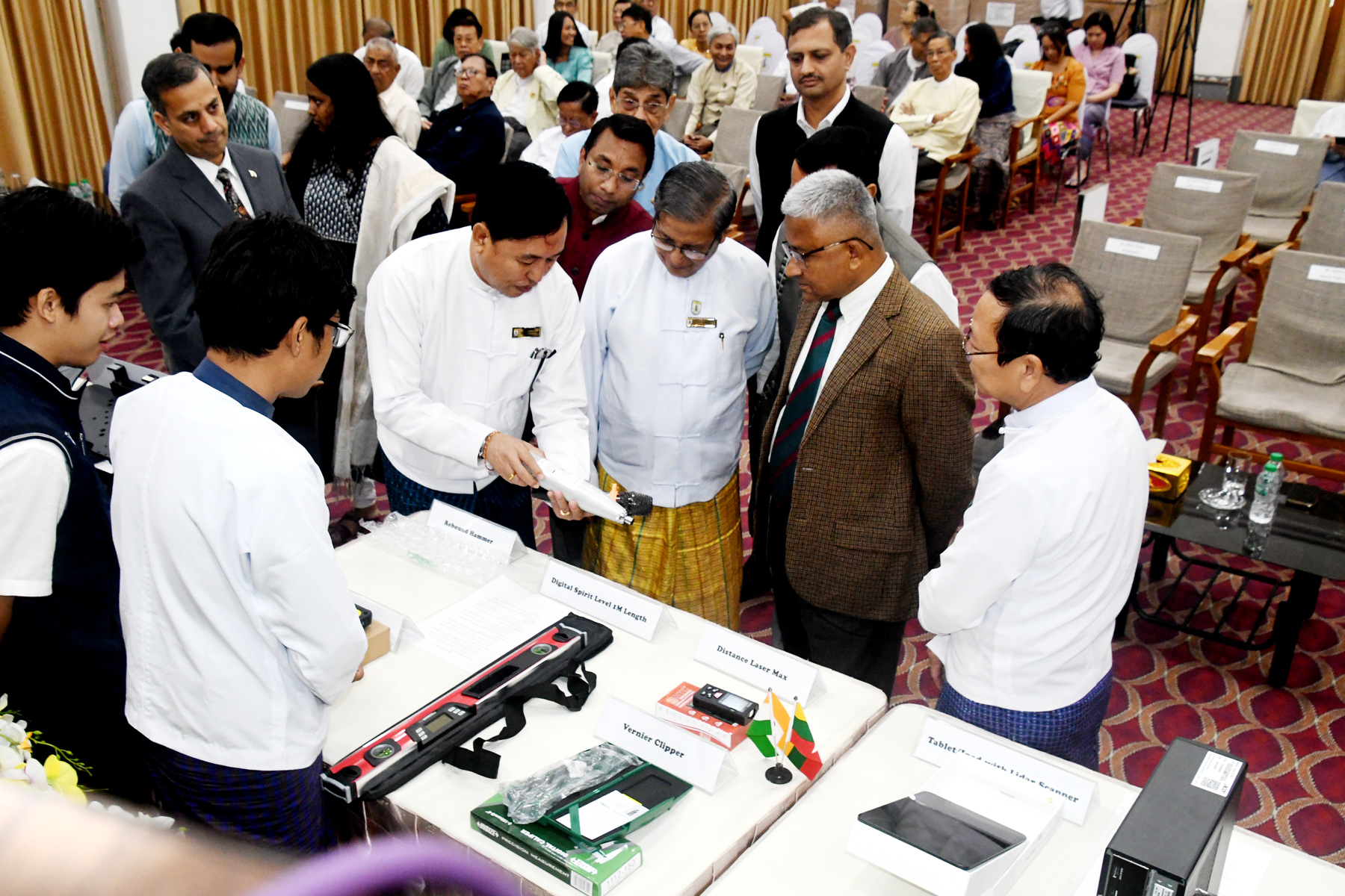 A handover ceremony for equipment donated by the Republic of India to the Myanmar Engineering Council for use in post-earthquake building inspections was held yesterday at the Function Hall of the Myanmar Engineering Federation in Hlaing Township, Yangon.
