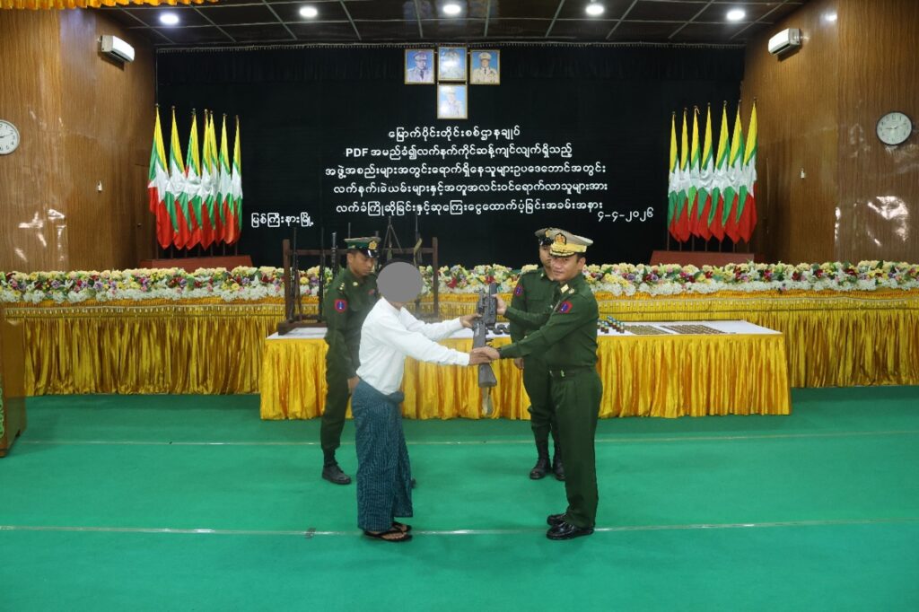 The State is inviting those involved in armed opposition, including groups under various names such as PDF, to re-enter the legal framework and is providing necessary assistance to those who do so. In line with this, eight male members from KIA, KPDF and PDF groups, who have come to understand and accept the peace processes of the State and Tatmadaw, returned to the legal fold together with arms and ammunition.