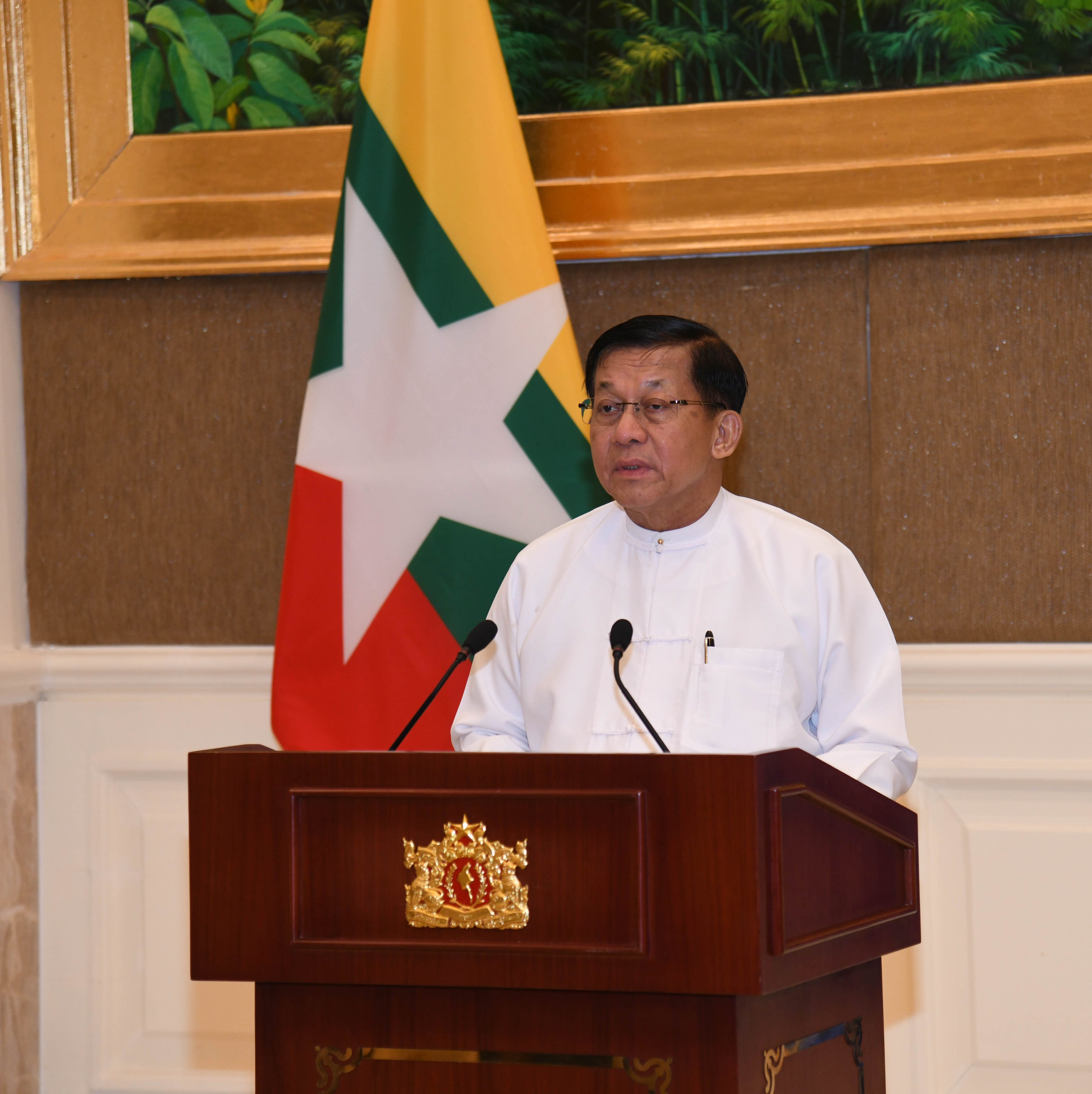 In his speech, the Senior General stated that Tatmadaw, under his leadership, had assumed responsibility for the State in accordance with the Constitution after the declaration of a state of emergency due to electoral irregularities in the 2020 general election, and has been carrying out State responsibilities from 1 February 2021 up to the present. Since taking office, numerous difficulties and challenges have been encountered, but these have been overcome through the collective efforts of the commission members, government officials, Tatmadaw personnel, and the people.