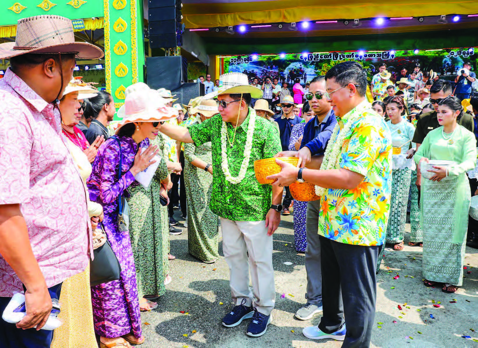The President and First Lady, alongside attendees, watched the Yain dance performances and then toured and encouraged the Satuditha (charity food) pavilions serving traditional Myanmar foods such as tea leaf (Laphet) and Htamane (glutinous rice delicacy).