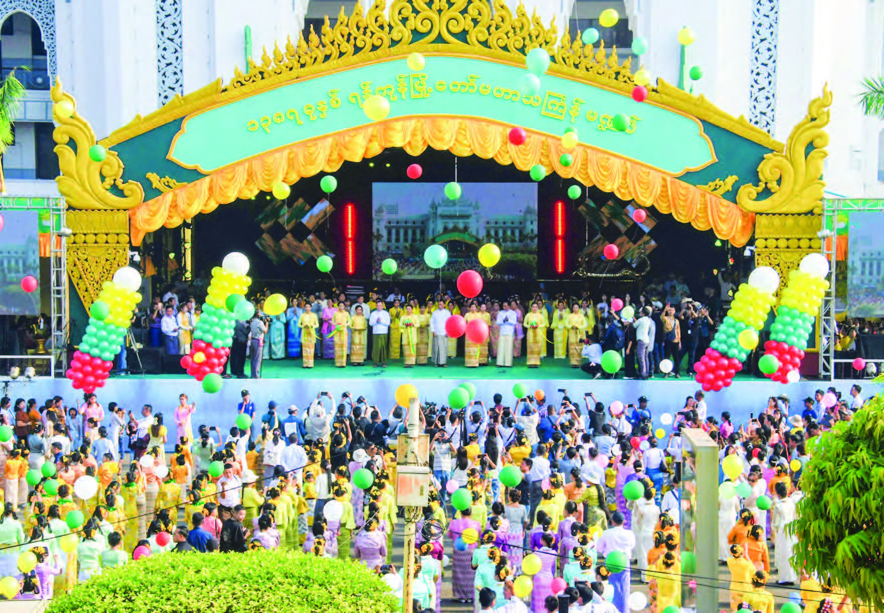 The opening ceremony of the Yangon City Maha Thingyan Pavilion in front of the Yangon City Hall in Kyauktada Township was attended by Yangon Region Chief Minister U Aung Naing Thu and his wife, Yangon Command Commander Brig-Gen Tun Min Lat and his wife, regional ministers and their wives, Yangon Mayor U Myo Myint Aung and his wife, other relevant officials, artistes, dance troupes and invitees.