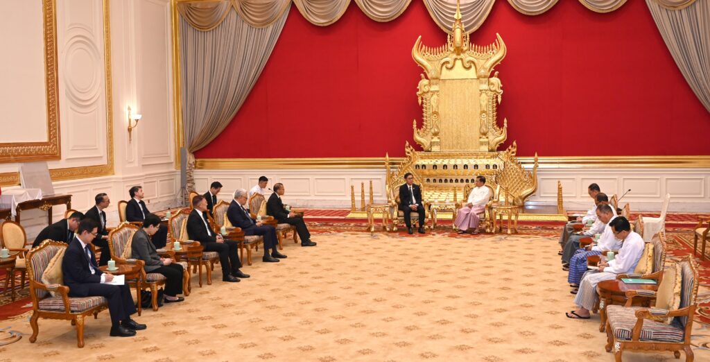 Thai Deputy Prime Minister and Minister of Foreign Affairs Mr Sihasak Phuangketkeow led a delegation to pay a courtesy call on Myanmar President U Min Aung Hlaing yesterday morning at the Presidential Palace Reception Hall in Nay Pyi Taw.