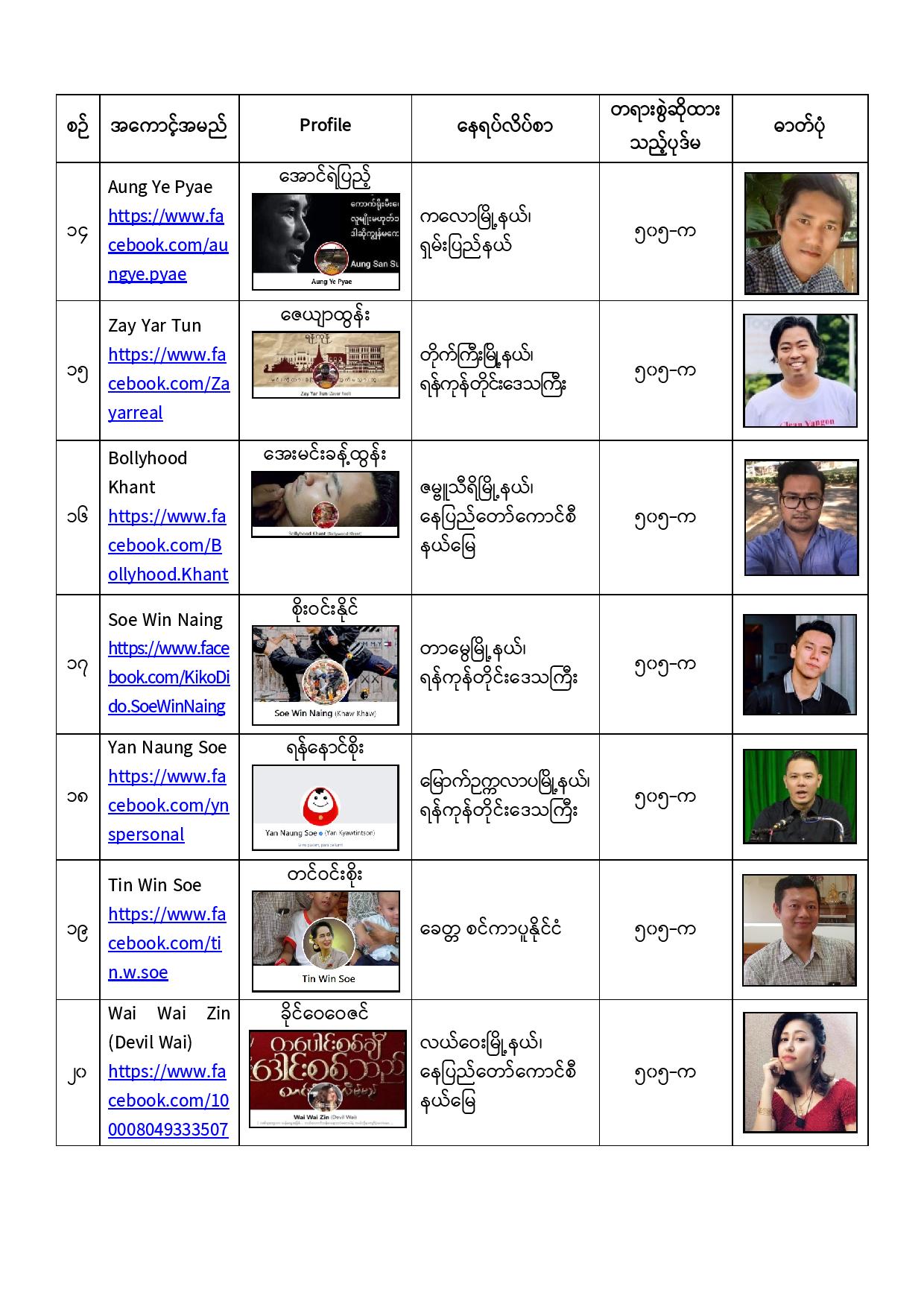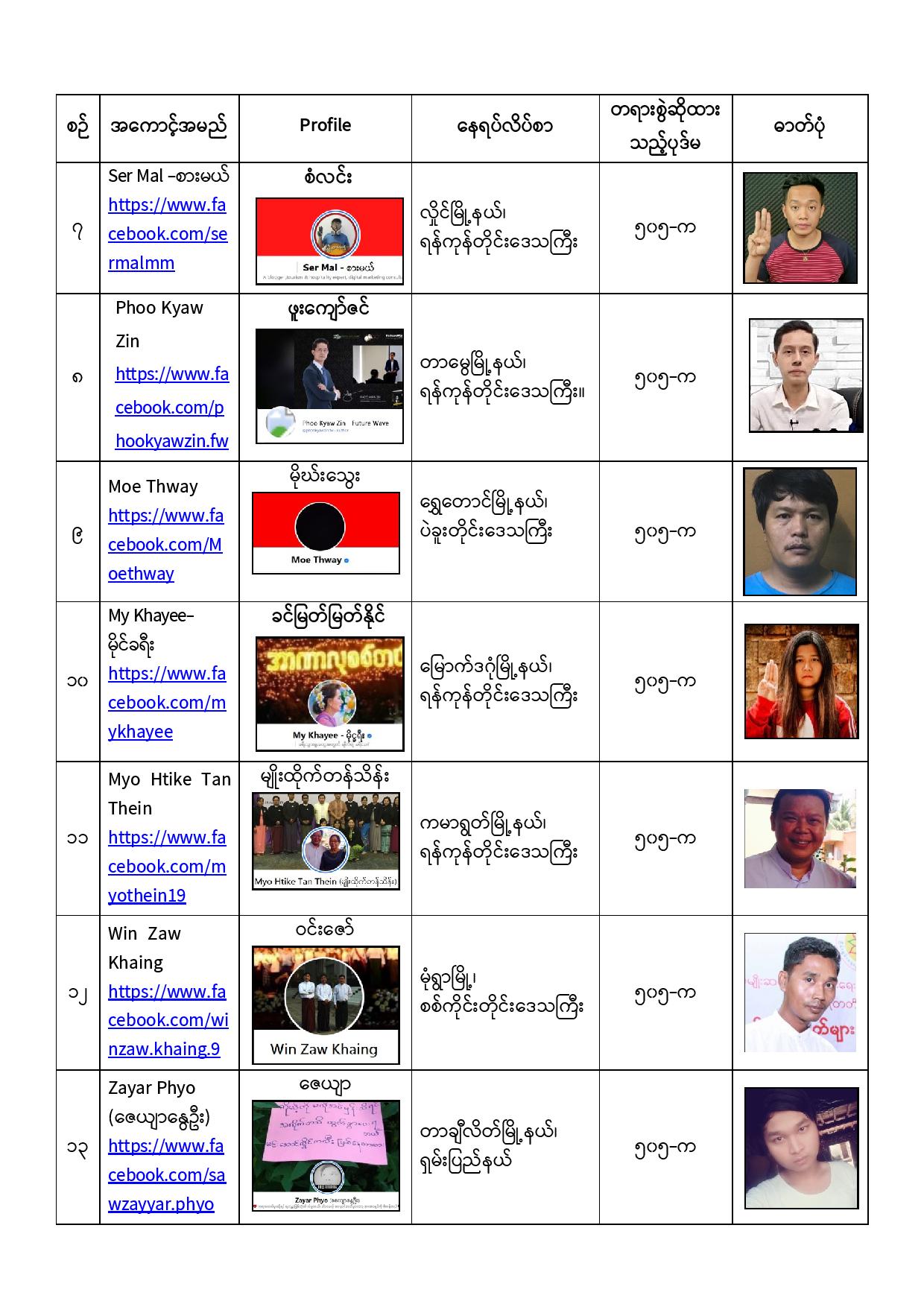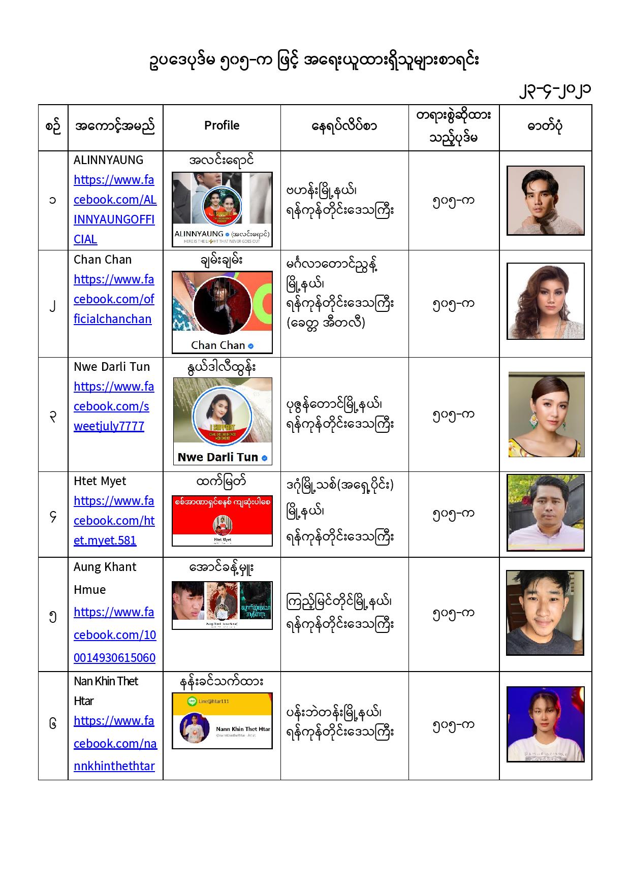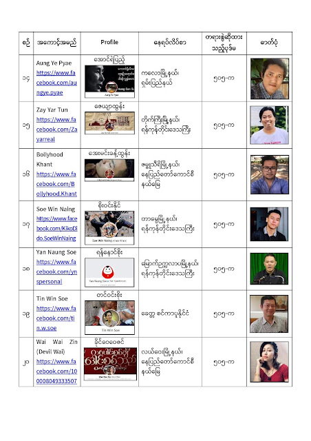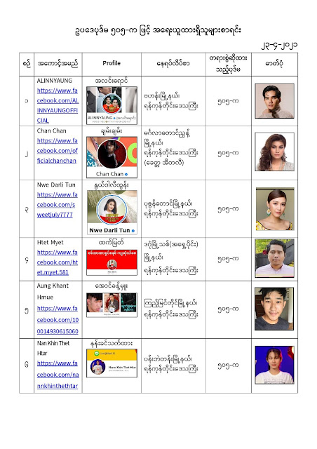 ထိုသို့ ထုတ်ပြန်ထားရှိသော အနုပညာရှင်အချို့နှင့် အခြားပါဝင်ပတ်သက်သူများမှာ ထွက်ပြေးတိမ်းရှောင်လျက်ရှိသဖြင့် အောက်ဖော်ပြပါ အနုပညာရှင်အချို့နှင့် အခြားပါဝင် ပတ်သက်သူများကို ရာဇသတ်ကြီး ပုဒ်မ ၅၀၅ - က ဖြင့် အမှုဖွင့်အရေးယူဆောင်ရွက် လျက်ရှိကြောင်းကို ထပ်မံထုတ်ပြန်အပ်ပါသည်-