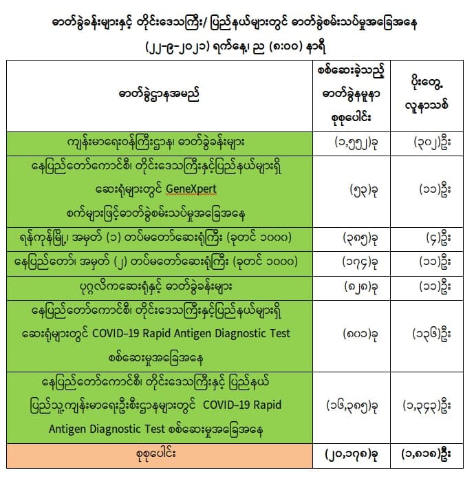 သို့ဖြစ်ပါ၍ ယနေ့အထိ ဓာတ်ခွဲနမူနာစုစုပေါင်း (၄,၁၆၈,၄၂၇)ခုအား စစ်ဆေးခဲ့ပြီး COVID-19 ဓာတ်ခွဲအတည်ပြုလူနာ စုစုပေါင်း (၄၅၁,၆၆၃) ဦး ရှိပြီ ဖြစ်ပါသည်။