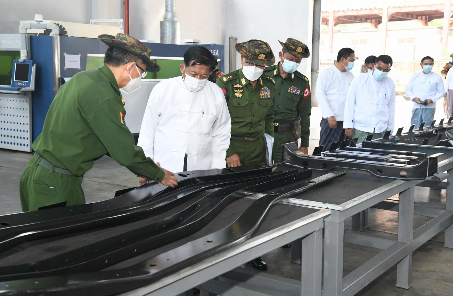 ဆက်လက်ပြီး နိုင်ငံတော်စီမံအုပ်ချုပ်ရေးကောင်စီဥက္ကဋ္ဌ နိုင်ငံတော်ဝန်ကြီးချုပ်နှင့် အဖွဲ့ဝင်များသည် စက်ရုံမှ ထုတ်လုပ်ထားရှိသည့် မီးသတ်ယာဉ်၊ ရေသယ်ယာဉ်၊ ဆေးဖျန်းယာဉ်နှင့် ဆီသယ်ယာဉ်များအား ကြည့်ရှုစစ်ဆေးကြသည်။