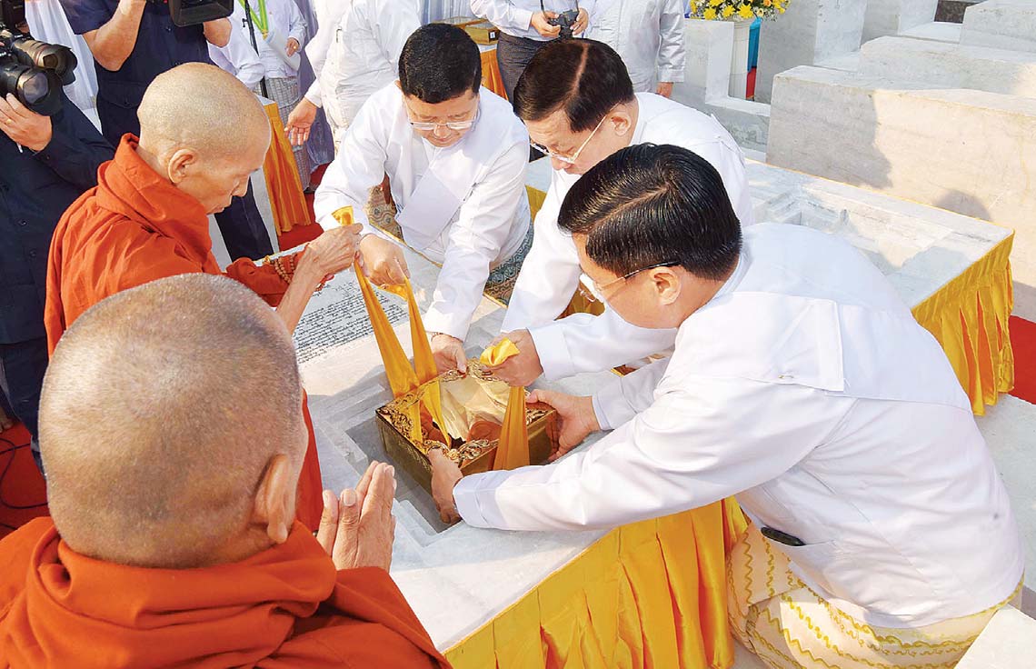 ထို့နောက် ပါဠိဆရာတော်ကြီးအမှူးပြုသည့် ဆရာတော်သံဃာတော်များနှင့် ဦးဆောင်ဘုရားဒါယကာ နိုင်ငံတော်စီမံအုပ်ချုပ်ရေးကောင်စီဥက္ကဋ္ဌ နိုင်ငံတော်ဝန်ကြီးချုပ် တို့သည် ဌာပနာတော်တိုက်များအား နံ့သာရည်များ ပက်ဖျန်းပူဇော်ကြသည်။ ယင်းနောက် ပါဠိဆရာတော်ဦးဆောင်၍ “ဇယန္တော ဗောဓိယာ မူလေ” အစချီသည့် ဇယမင်္ဂလာ အောင်ဂါထာများကို ရွတ်ဆိုပူဇော်ပြီး အခမ်းအနားမှူးက အောင်ဆုမင်္ဂလာ အမျှဝေစာတမ်းလွှာ ကိုဖတ်ကြား၍ ဦးဆောင်ဘုရားဒါယကာ နိုင်ငံတော်စီမံအုပ်ချုပ်ရေးကောင်စီဥက္ကဋ္ဌ နိုင်ငံတော်ဝန်ကြီးချုပ် အမှူးပြုသည့် ပြည်ထောင်စုသမ္မတမြန်မာနိုင်ငံတော် တစ်ဝန်းလုံးမှ ဌာပနာတော်ကုသိုလ်ရှင်များ၊ ပြည်သူပြည်သားများ အားလုံးဝမ်းမြောက်နုမော် သာဓုခေါ်ဆို နိုင်ရန်အတွက် မေတ္တာပြုအမျှပေးဝေကြကာ သာဓု ၃ ကြိမ် ရွတ်ဆိုတော်မူကြသည်။