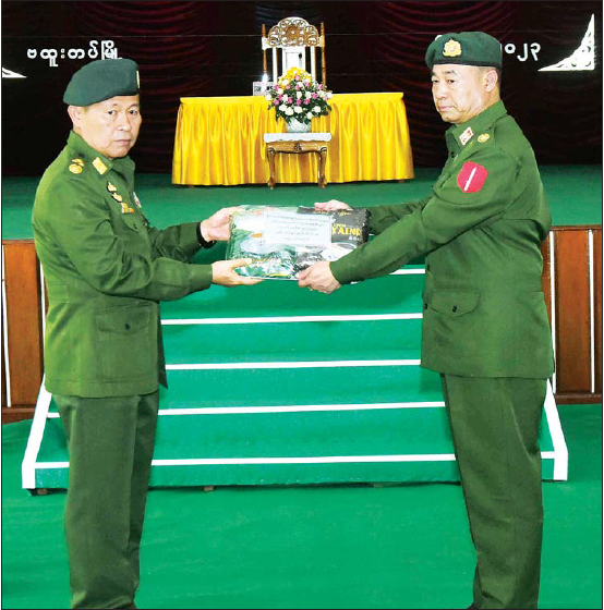 အလားတူညှိနှိုင်းကွပ်ကဲရေးမှူး (ကြည်း၊ ရေ၊ လေ) ဗိုလ်ချုပ်ကြီးမောင်မောင်အေးက သင်တန်းသားများအတွက် အားကစားပစ္စည်းများကို ပေးအပ်ရာတာဝန်ရှိသူများက လက်ခံရယူသည်။
