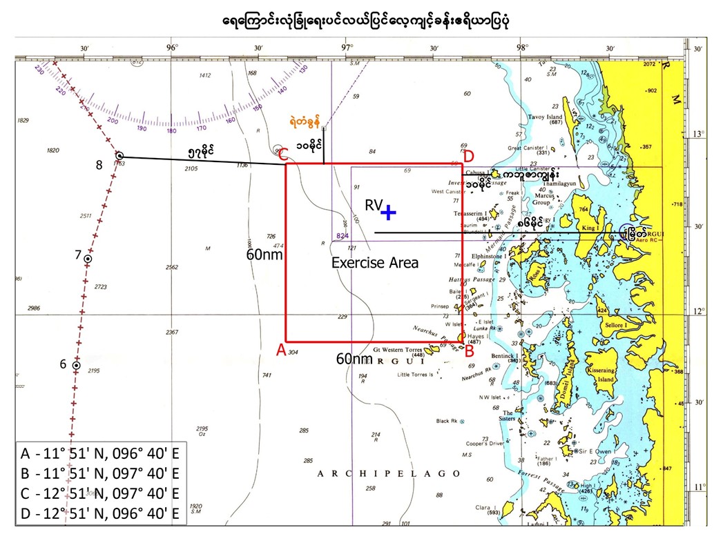 ၂။ သို့ဖြစ်ပါ၍ လေ့ကျင့်ခန်းဆောင်ရွက်စဉ်ကာလအတွင်း ဘေးအန္တရာယ်ကင်းရှင်းစေရေးအတွက် အဆိုပါဧရိယာမှ ၅ မိုင်ပတ်လည်အား သင်္ဘောကြီး/ငယ်များ၊ ကုန်တင်/ စက်လှေများ၊ ငါးဖမ်းသင်္ဘောများ၊ စက်တပ်သမ္ဗာန်များ ဖြတ်သန်းသွားလာခြင်း၊ ကျောက်ချရပ်နားခြင်း၊ ငါးဖမ်းခြင်း၊ ငါးဖမ်းကိရိယာများချထားခြင်း မရှိစေရန်နှင့် လေယာဉ်၊ ရဟတ်ယာဉ်များအမြင့်ပေ ၁၅၀၀၀ (တစ်သောင်းငါးထောင်) အောက် ဖြတ်ကျော်ပျံသန်းခြင်း မပြုကြရန် အသိပေးကြေညာအပ်ပါသည်။