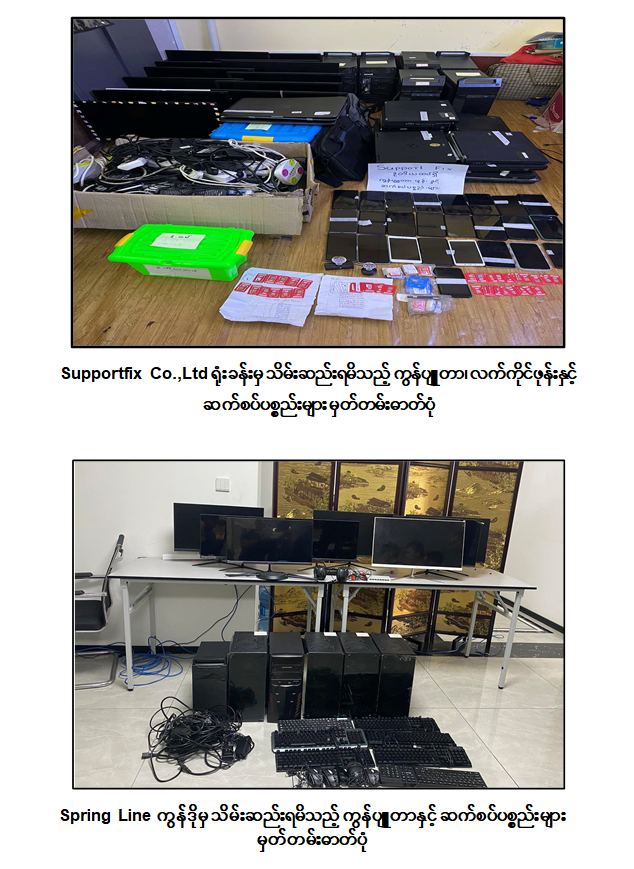 ထိုသို့ဆောင်ရွက်ခဲ့ရာ ၂၀၂၃ ခုနှစ်၊ အောက်တိုဘာလ ၂၆ ရက်တွင် ရန်ကုန်တိုင်းဒေသကြီး၊ တာမွေမြို့နယ်၊ ဦးချစ်မောင်လမ်း၊ ဦးချစ်မောင်အိမ်ရာ၊ တိုက်အမှတ်(S-19)တွင် ရုံးခန်းဖွင့်လှစ်ထားသည့် Supportfix Co.,Ltd အား သတင်းအရ လုံခြုံရေးအဖွဲ့အစည်းများမှ ဝင်ရောက်စီးနင်းရှာဖွေခဲ့ရာ ဇူကျန်း(ခ) လောက်ဖ၊ ၃၄ နှစ်၊ (ဘ) ဦးလောက်ရှီးအပါအဝင် တရားခံ ကျား ၆၆ ဦး၊ မ ၂၂ ဦး၊ စုစုပေါင်း ၈၈ ဦးတို့အား ပြည်ပနိုင်ငံသားများ၏အချက်အလက်များစုဆောင်း၍ ငွေကြေးလိမ်လည်နိုင်ရေး ဆောင်ရွက်ရာတွင်အသုံးပြုသည့် ကွန်ပျူတာ၊ မိုဘိုင်းဖုန်း စသည့် ဆက်စပ်ပစ္စည်းများနှင့်အတူ ဖမ်းဆီးရမိခဲ့သည်။