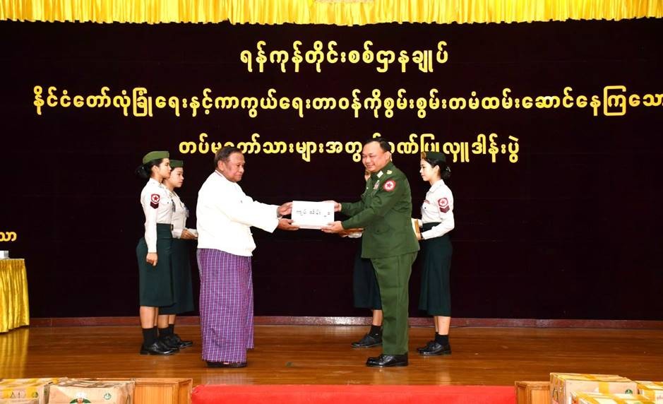 ထိုသို့ ပေးအပ်လျက်ရှိရာ ယနေ့တွင် ရန်ကုန်တိုင်းဒေသကြီးအတွင်းရှိ စေတနာရှင် အလှူရှင်များက ဂုဏ်ပြုချီးမြှင့်ငွေများပေးအပ်ခြင်းကို ရန်ကုန်တိုင်းစစ်ဌာနချုပ်ရှိ အနော်ရထာခန်းမ၌ ပြုလုပ်ရာ တိုင်းမှူး ဗိုလ်ချုပ်ဇော်ဟိန်းနှင့် တာဝန်ရှိသူများ၊ စေတနာရှင် အလှူရှင်များ တက်ရောက်ကြသည်။
