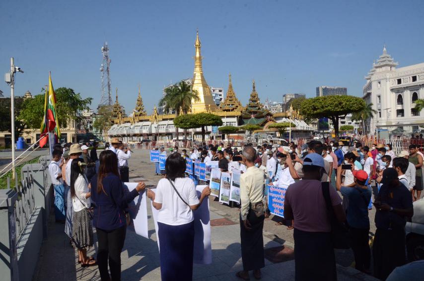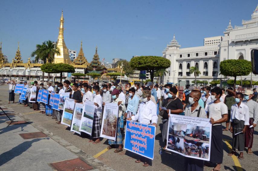 မြန်မာ့အမျိုးသားရေးကွန်ရက်အဖွဲ့မှဦးဆောင်ပြီး "အလုံးစုံပျက်သုဉ်းရေးကို လုပ်ဆောင်နေသော အကြမ်းဖက်အဖွဲ့များ၏ အကြမ်းဖက်လုပ်ရပ်များအား ဆန့်ကျင်ရှုတ်ချပွဲ" ကို ယနေ့နံနက် ၉ နာရီခွဲက ရန်ကုန်မြို့၊ မြို့တော်ခန်းမအရှေ့၊ မဟာဗန္ဓုလပန်းခြံဘေး၊ ယာဉ်ရပ်နားကွင်း၌ ကျင်းပခဲ့သည်။
