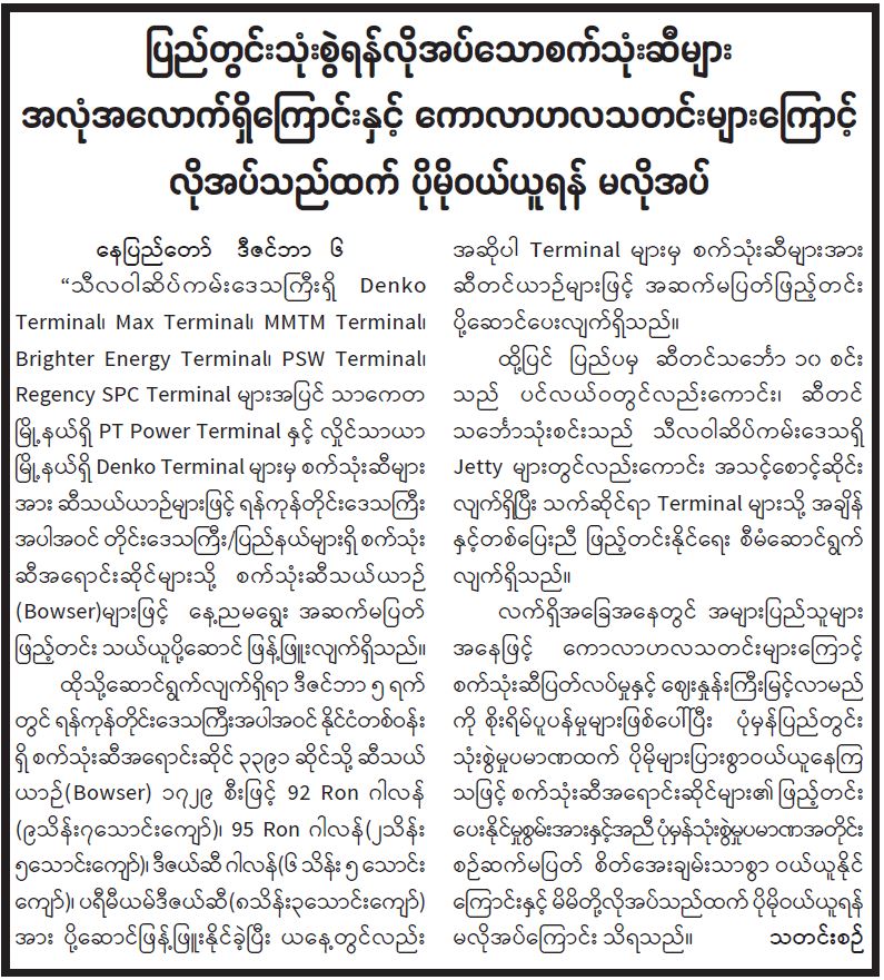 ပြည်တွင်းသုံးစွဲရန် လိုအပ်သော စက်သုံးဆီများ အလုံအလောက် ရှိကြောင်းနှင့် ကောလာဟလသတင်းများကြောင့် လိုအပ်သည်ထက် ပိုမိုဝယ်ယူရန် မလိုအပ် 12/07/2023