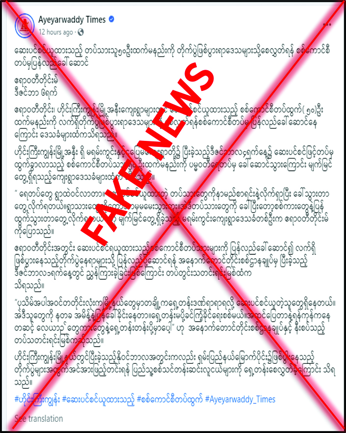 ဧရာဝတီတိုင်းဒေသကြီး ဟိုင်းကြီးကျွန်းမြို့ အနီးကျေးရွာများတွင် ဆေးပင်စင်ယူထားသည့် တပ်မတော်မှအငြိမ်းစား ၅၀ ထက်မနည်းကို လက်ရှိတိုက်ပွဲဖြစ်ပွားရာဒေသများသို့ စေလွှတ်ရန် ဒီဇင်ဘာလ ၄ ရက်နေ့က ပမ္မဝတီရေတပ်မှ စစ်ကားများဖြင့် ခေါ်ဆောင်သွားကြောင်း မျက်မြင်တွေ့ရှိရသည့် ကျေးရွာဒေသခံများထံကသိရကြောင်း တရားမဝင် ပြည်ဖျက်မီဒီယာများမှ လူမှုကွန်ရက်စာမျက်နှာများတွင် လုပ်ကြံသတင်းတု၊ သတင်းအမှားများဖြန့်ဝေရေးသားလျက်ရှိပြီး အဆိုပါကျေးရွာများသို့ မည်သည့်တပ်မတော်သုံးမော်တော်ယာဉ်များ လာရောက်ခဲ့ခြင်းနှင့် ခေါ်ဆောင်သွားခြင်း လုံးဝမရှိကြောင်းနှင့် ပြည်သူများ အထင်အမြင်လွဲမှားစေရန်ရည်ရွယ်၍ လိမ်လည်ရေးသားဖြန့်ဝေခြင်းသာ ဖြစ်ကြောင်း သိရသည်။