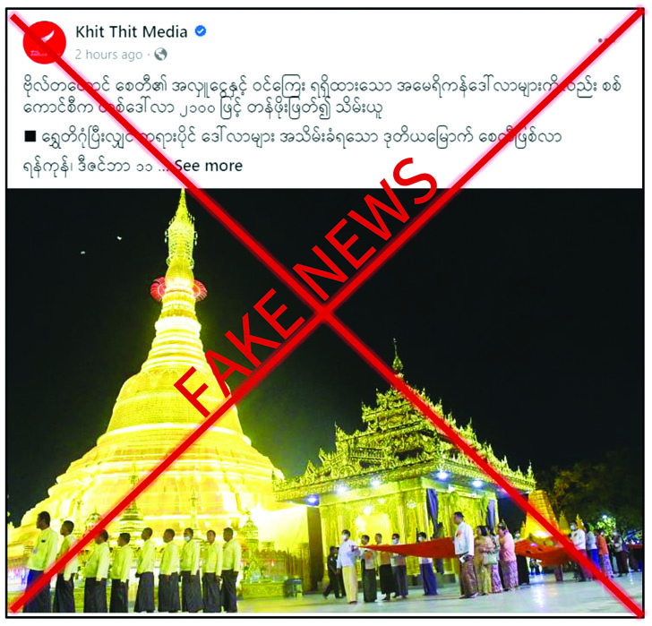 ရွှေတိဂုံစေတီတော်ကြီးသို့ လှူဒါန်းထားသော အလှူငွေများနှင့် ဝင်ကြေးများမှ ဘဏ်များတွင် အပ်ငွေအဖြစ် အပ်နှံထားသော အမေရိကန်ဒေါ်လာများကို တစ်ဒေါ်လာ လျှင် ငွေကျပ် ၂၁၀၀ နှုန်းဖြင့် တန်ဖိုးဖြတ်သိမ်းယူပြီး မြန်မာကျပ်ငွေများ ပြန်လည်ထုတ်ပေးခဲ့ကြောင်း၊ ထို့အတူဗိုလ်တထောင်စေတီ၏ အလှူငွေနှင့်ဝင်ကြေး အမေရိကန်ဒေါ်လာများကိုလည်း တစ်ဒေါ်လာလျှင် ငွေကျပ် ၂၁၀၀ ငွေလဲနှုန်းဖြင့် တန်ဖိုးဖြတ်၍ မြန်မာကျပ်ငွေများ ပြန်လည်ထုတ်ပေးခဲ့ကြောင်း ဂေါပကအဖွဲ့၊ ဘဏ္ဍာရေးနှင့်နီးစပ်သော သတင်းအရင်းအမြစ်က ပြောသည်ဟု လုပ်ကြံသတင်းတုများအား တရားမဝင်ပြည်ဖျက်မီဒီယာ Khit Thit မှ လူမှုကွန်ရက်စာမျက်နှာများတွင် ရေးသားဖြန့်ဝေလျက်ရှိသည်ကို တွေ့ရှိရသည်။