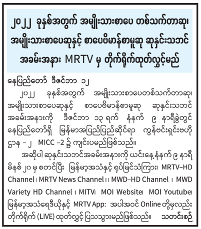 ၂၀၂၂ ခုနှစ်အတွက် အမျိုးသားစာပေ တစ်သက်တာဆု၊ အမျိုးသားစာပေဆုနှင့် စာပေဗိမာန်စာမူဆု ဆုနှင်းသဘင် အခမ်းအနား MRTV မှ တိုက်ရိုက်ထုတ်လွှင့်မည် 12/13/2023