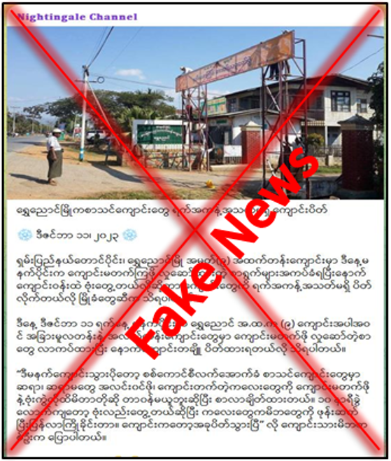 “ရှမ်းပြည်နယ်တောင်ပိုင်း၊ ရွှေညောင်မြို့ အမှတ်(၉)အထက်တန်းကျောင်းတွင် ကျောင်း မတက်ကြရန် လှုံ့ဆော်ထားသည့်စာရွက်များ အကပ်ခံရကြောင်းနှင့် ကျောင်းဝန်းထဲ ဗုံးတွေ့တယ်ဟုဆိုကာ ကျောင်းတွေကို ရက်အကန့်အသတ်မရှိ ပိတ်လိုက်သည်” ဟု ပြည်ဖျက်မီဒီယာအချို့မှ မဟုတ်မမှန်ကောလာဟလ သတင်းများဖြန့်ဝေရေးသားလျက်ရှိသည်ကို တွေ့ရှိရပါသည်။