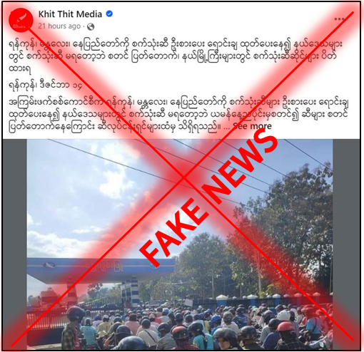 ရန်ကုန်၊ မန္တလေး၊ နေပြည်တော်တို့တွင် စက်သုံးဆီများ ဦးစားပေးရောင်းချထုတ်ပေးနေ၍ နယ်ဒေသများတွင် စက်သုံးဆီမရတော့ဘဲ ဆီများစတင်ပြတ်တောက်နေသည်ဟု လူမှုကွန်ရက်စာမျက်နှာများတွင် ပြည်သူများ စိုးရိမ်ပူပန်စိတ်ဖြစ်ပေါ်လာစေရေး သတင်းအမှားများ ထုတ်လွှင့်လျက်ရှိသည်ကို တွေ့ရှိရသည်။