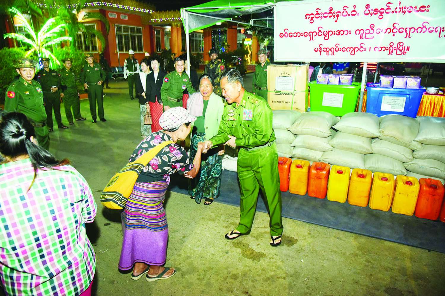 ယင်းနောက် လားရှိုးမြို့တွင် ရောက်ရှိနေသည့် ယာယီနေရပ်စွန့်ခွာ ဒေသခံပြည်သူများအတွက် နိုင်ငံတော်စီမံအုပ်ချုပ်ရေးကောင်စီဥက္ကဋ္ဌ နိုင်ငံတော်ဝန်ကြီးချုပ်၊ တပ်မတော်ကာကွယ်ရေးဦးစီးချုပ်က ပေးအပ်သည့် အဝတ်အထည်များ၊ ဆန်၊ ဆီနှင့် စားသောက်ဖွယ်ရာပစ္စည်းများကို နိုင်ငံတော်စီမံအုပ်ချုပ်ရေးကောင်စီဒုတိယဥက္ကဋ္ဌ ဒုတိယတပ်မတော်ကာကွယ်ရေးဦးစီးချုပ်၊ ကာကွယ်ရေးဦးစီးချုပ်(ကြည်း)နှင့် ဇနီးတို့က ပေးအပ်ရာ ယာယီနေရပ်စွန့်ခွာ ဒေသခံပြည်သူများကိုယ်စား တာဝန်ရှိသူများက လက်ခံရယူကြသည်။