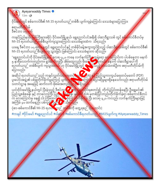 ကချင်ပြည်နယ်၊ မြစ်ကြီးနားခရိုင်၊ ဝိုင်းမော်မြို့နယ်၊ ရွှေညောင်ပင်အနီးရှိ ဝါဆာဒီရွာသစ်တွင် ဒီဇင်ဘာ ၁၇ ရက်နေ့က တပ်မတော်မှ Mi-35 ရဟတ်ယာဉ်တစ်စီးပျက် ကျသွားကြောင်း ဒေသခံများထံက သိရသည်ဟု ပြည်ဖျက်မီဒီယာတစ်ခုဖြစ်သည့် Ayeyarwaddy Times မှ မဟုတ်မမှန် ကောလာဟလသတင်းများ ရေးသားဖြန့်ဝေလျက်ရှိသည်ကို တွေ့ရှိရသည်။