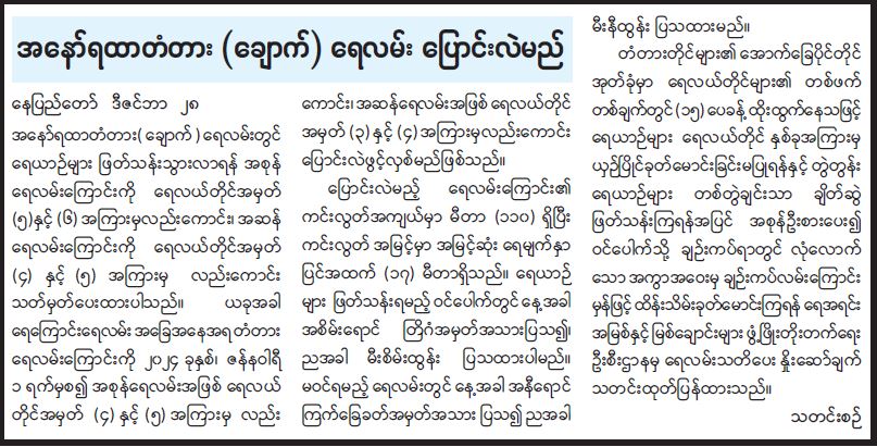ရန်ကုန်မြို့နှင့် မန္တလေးမြို့အတွက် ရည်ညွှန်းလက်ကားဈေးနှုန်းများနှင့် ပြည်ထောင်စုနယ်မြေ နေပြည်တော်၊ တိုင်းဒေသကြီး/ပြည်နယ် မြို့တော်များအတွက် ရည်ညွှန်းလက်လီစျေးနှုန်းများ