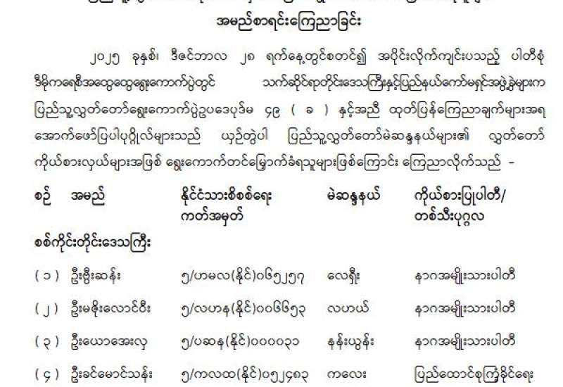 နိုင်ငံတော်စီမံအုပ်ချုပ်ရေးကောင်စီဥက္ကဋ္ဌ နိုင်ငံတော်ဝန်ကြီးချုပ် ဗိုလ်ချုပ်မှူးကြီးမင်းအောင်လှိုင်သည် တရုတ်ပြည်သူ့သမ္မတနိုင်ငံ အစိုးရ၏ ဖိတ်ကြားချက်အရ တရုတ်ပြည်သူ့သမ္မတနိုင်ငံတွင် ကျင်းပ သည့် အဋ္ဌမအကြိမ်မြောက် မဟာမဲခေါင်ဒေသခွဲထိပ်သီးအစည်းအဝေး၊ (၁၀)ကြိမ်မြောက် ဧရာဝတီ - ကျောက်ဖရား - မဲခေါင် စီးပွားရေးပူးပေါင်း ဆောင်ရွက်မှု မဟာဗျူဟာထိပ်သီးအစည်းအဝေးနှင့်(၁၁)ကြိမ်မြောက် ကမ္ဘောဒီးယား - လာအို - မြန်မာ - ဗီယက်နမ် ပူးပေါင်းဆောင်ရွက်မှု ထိပ်သီးအစည်းအဝေးများသို့ တက်ရောက်ခဲ့ကာ တရုတ်ပြည်သူ့သမ္မတနိုင်ငံ၊ လာအိုနိုင်ငံ၊ ကမ္ဘောဒီးယားနိုင်ငံ၊ ဗီယက်နမ်နိုင်ငံ၊ ထိုင်းနိုင်ငံတို့နှင့် တွေ့ဆုံဆွေးနွေးခဲ့ပြီး မြန်မာနိုင်ငံနှင့် ပြည်သူများ အတွက် အထူးကောင်းမွန်သည့် အကျိုးကျေးဇူးရလဒ်များအား ရယူ နိုင်ခဲ့ခြင်း၊ ဧရာဝတီ - ကျောက်ဖရား - မဲခေါင် စီးပွားရေးပူးပေါင်း ဆောင်ရွက်မှုမဟာဗျူဟာ၏ အလှည့်ကျဥက္ကဋ္ဌ တာဝန်ယူခြင်းတို့အတွက် ဗုဒ္ဓဘာသာကလျာဏယုဝအသင်း YMBA(ဗဟို)က အထူးဂုဏ်ယူဝမ်းမြောက်ပါကြောင်း သတင်းထုတ်ပြန်ကြေညာအပ်ပါသည်။