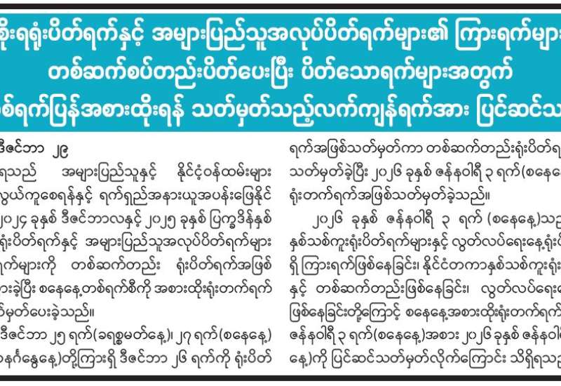 အိမ်တိုင်းအိမ်တိုင်းက မီးကိုကြိုတင်ကာကွယ်တားဆီးနိုင်ရန် မြန်မာနိုင်ငံမီးသတ်တပ်ဖွဲ့မှ အောက်ပါစည်းကမ်းချက်များကို လိုက်နာဆောင်ရွက်ကြပါရန် မေတ္တာရပ်ခံထားသည် -