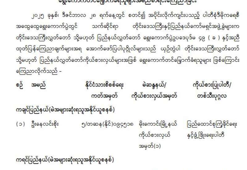 တိုင်းဒေသကြီးလွှတ်တော် သို့မဟုတ် ပြည်နယ်လွှတ်တော်ကိုယ်စားလှယ်အဖြစ် ရွေးကောက်တင်မြှောက်ခံရသူများ အမည်စာရင်းကြေညာခြင်း