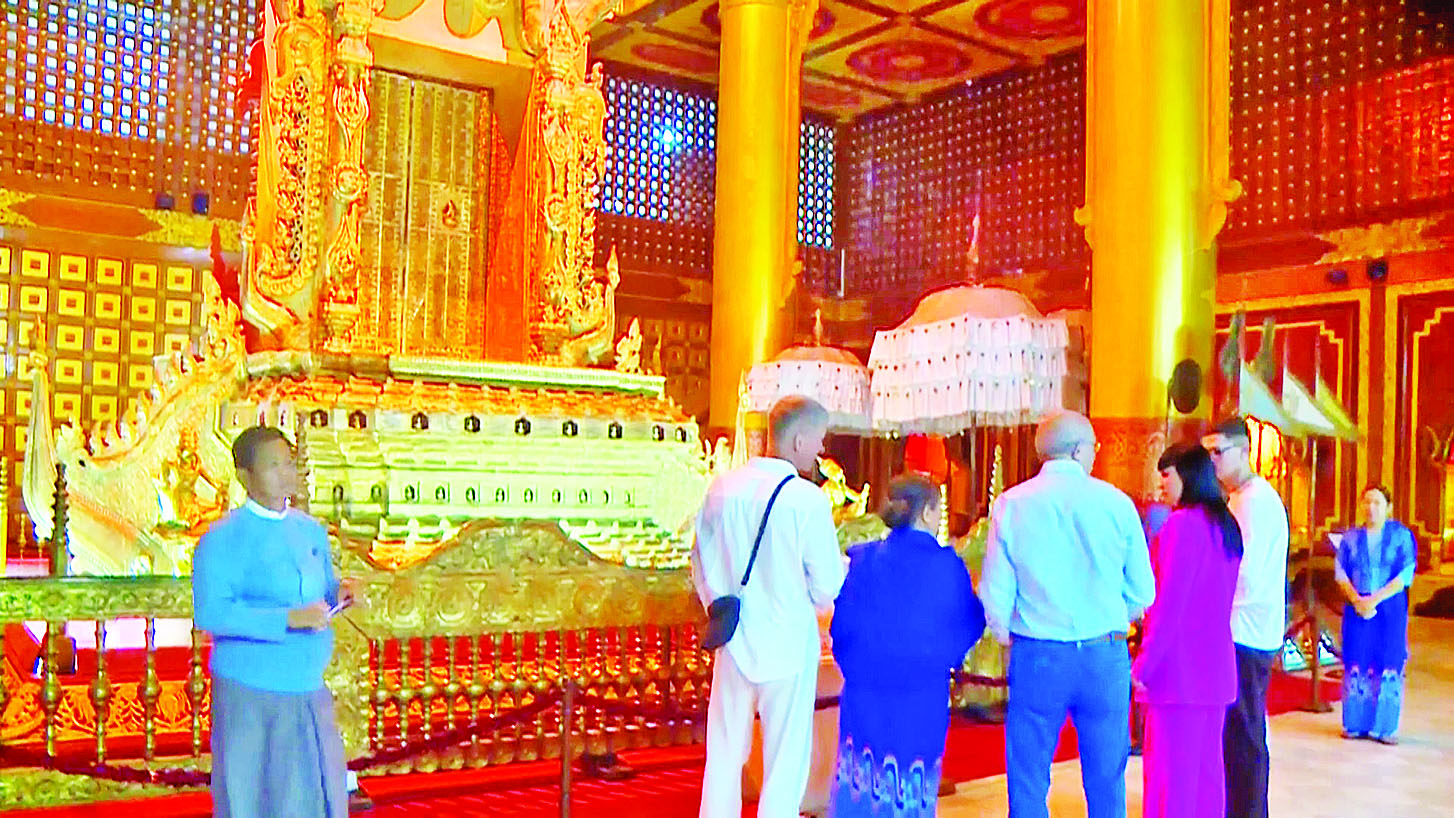 ဦးစွာ အမျိုးသားပြတိုက်၌ မင်းခမ်းတော်ပစ္စည်းပြခန်းများ အပါအဝင် ခင်းကျင်းပြသထားသည်များကို ကြည့်ရှုလေ့လာပြီး ဧည့်သည်တော် မှတ်တမ်းစာအုပ်တွင် လက်မှတ်ရေးထိုးကြသည်။