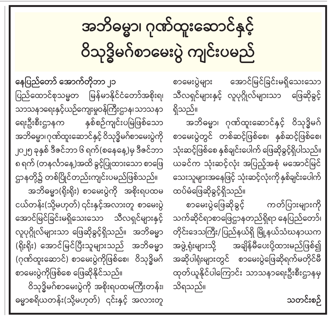 အဘိဓမ္မာ၊ ဂုဏ်ထူးဆောင်နှင့် ဝိသုဒ္ဓိမဂ်စာမေးပွဲ ကျင်းပမည်