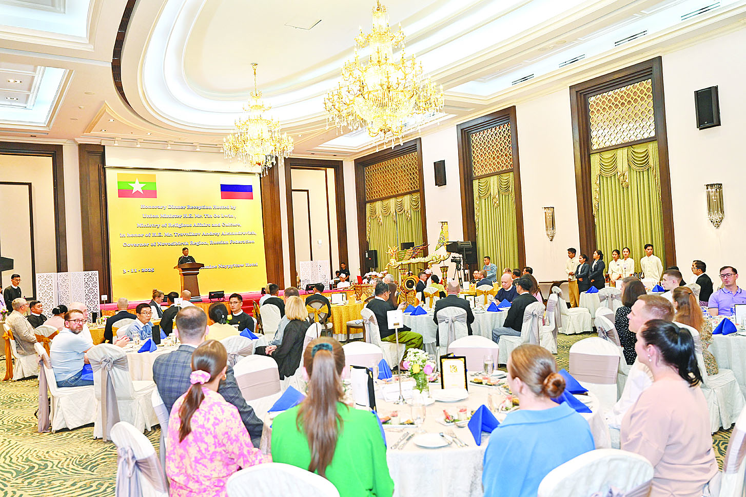 ညပိုင်းတွင် သာသနာရေးနှင့် ယဉ်ကျေးမှုဝန်ကြီးဌာန ပြည်ထောင်စုဝန်ကြီး ဦးတင်ဦးလွင်က ရုရှားဖက်ဒရေးရှင်းနိုင်ငံ နိုဗိုစီဗစ်ဒေသအုပ်ချုပ်ရေးမှူး ဦးဆောင်သောကိုယ်စားလှယ်အဖွဲ့အား Jasmine Naypyitaw Hotel ၌ ဂုဏ်ပြုညစာဖြင့် တည်ခင်းဧည့်ခံသည်။